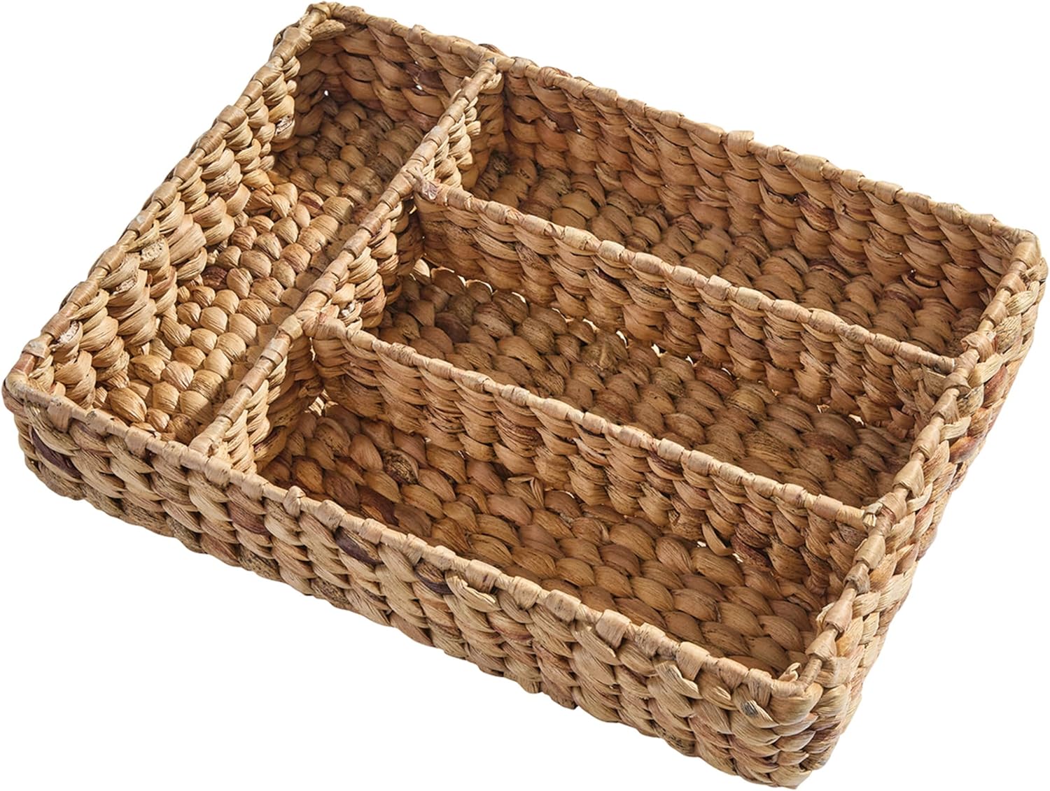 Elevate your room space with our stylish woven utensil organizer, blending functionality with natural rattan charm. Its versatile design seamlessly complements a variety of decor styles, from coastal to bohemian. With its ample capacity and lightweight design, this durably braided organizer is both practical and decorative with its four sectioned compartments that keeps any space tidy and organized. Offers a convenient organizer to utilize during various activities including picnics, dinner parties, and everyday meals. Multifunctional storage basket to utilize throughout the house from your kitchen drawers, dining room space, bedroom, vanity, or office to store ready-to-use utensils, serveware, office items, craft supplies, makeup brushes, and more. Spacious enough to easily organize forks, knives, spoons, and other flatware.