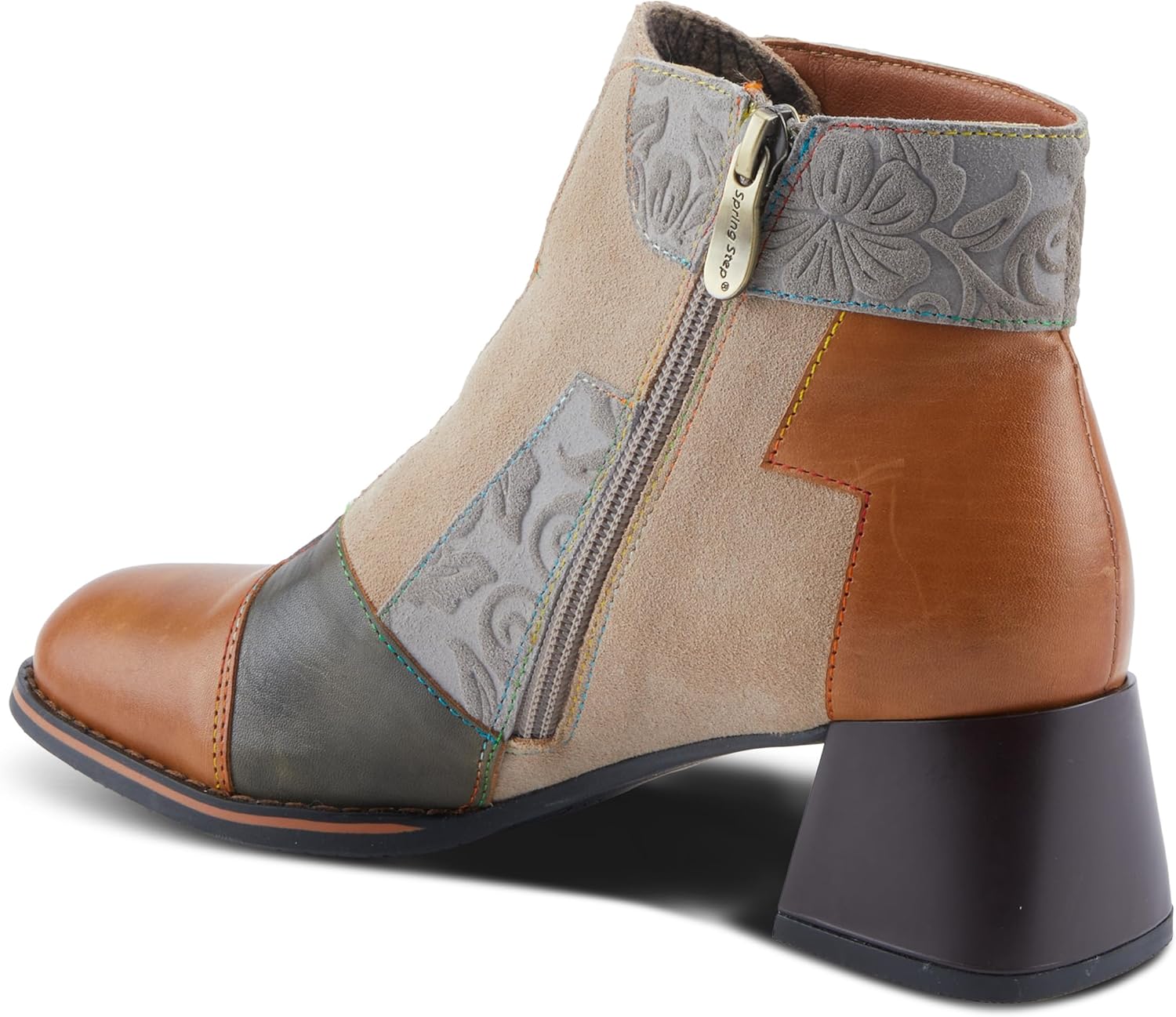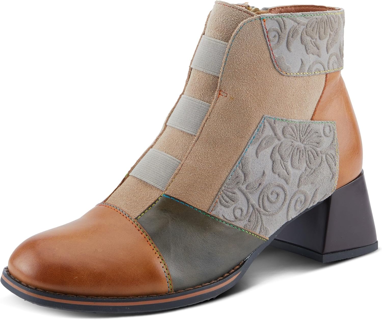 A harmonious blend of rich leather and luxurious suede adorned with captivating embossed floral designs, each color exudes elegance and warmth. The merge between style and functionality makes this style perfect for embracing the cozy vibes of the season. Stylish booties' design with three elastic gore straps in the front for a secure and comfortable fit. Plush velvet lining provides exceptional comfort and warmth. Contrasted color chunky sturdy heel offers stability and a fashion-forward touch to your look. Disclaimer: L’Artiste products are made with natural tanned leather using traditional hand painting techniques. This unique finishing process is used to create a natural effect with color variations to deliver authentic look and beauty.