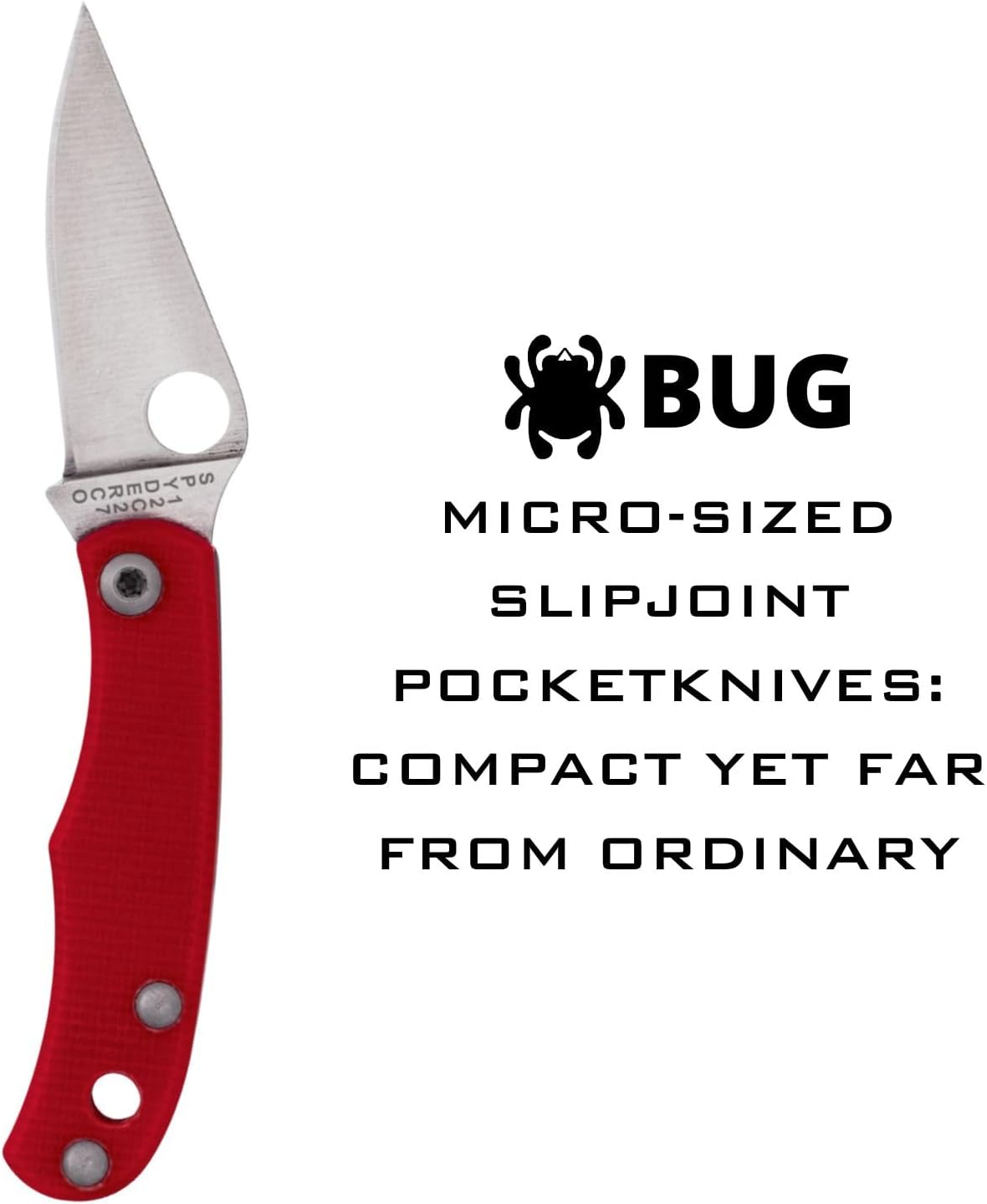 This beautiful Spyderco Red G-10 Bug Slip-joint is handcrafted in China and comes with a Limited Lifetime Manufacturer's Warranty. New and never been used or re-sharpened, this gorgeous knife is 1 3/4 inches long (folded/closed) and weighs approximately 0.3 ounces. This knife utilizes a 1 1/4" Skinner blade with a plain edge, full-flat grind, 1.8mm thickness, thumb ramp, and thumb hole. The blade material is Sandvik 12C27 Stainless Steel with a satin finish. The handle is Red G-10 with a lanyard/keychain hole. If you are looking for a great knife to collect, carry or give as a gift, don't pass this one up!