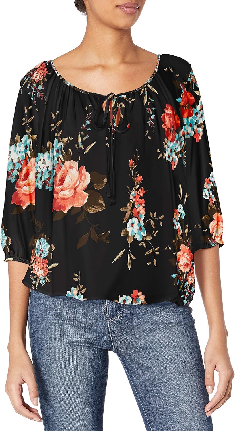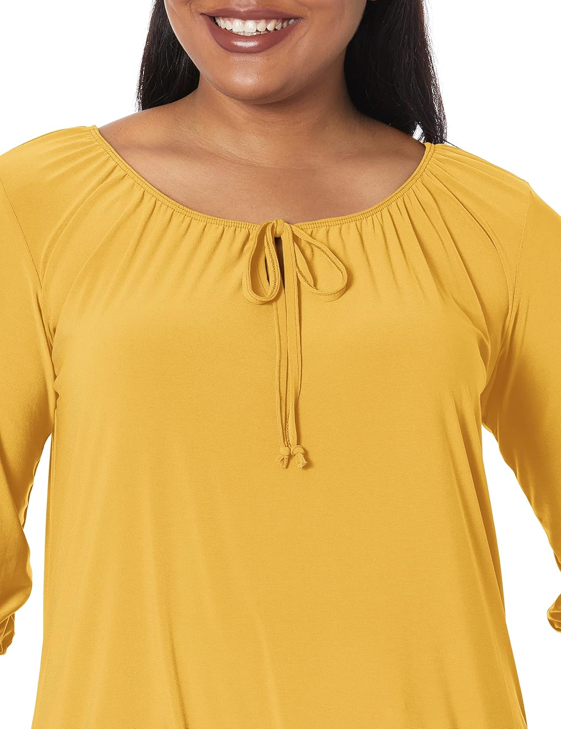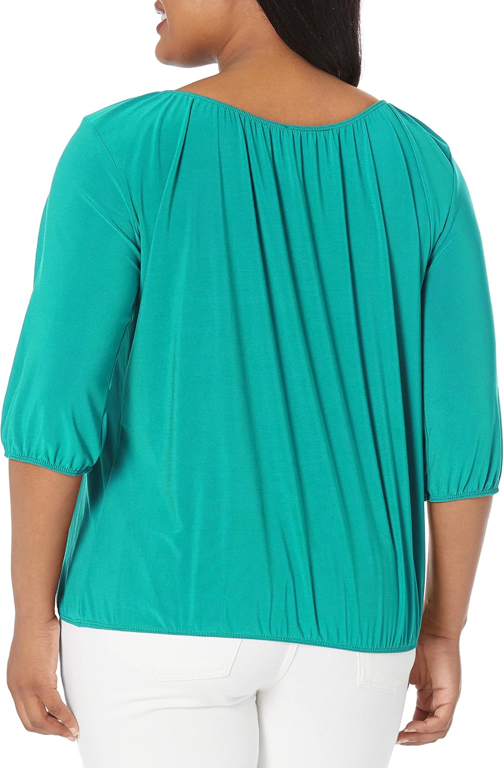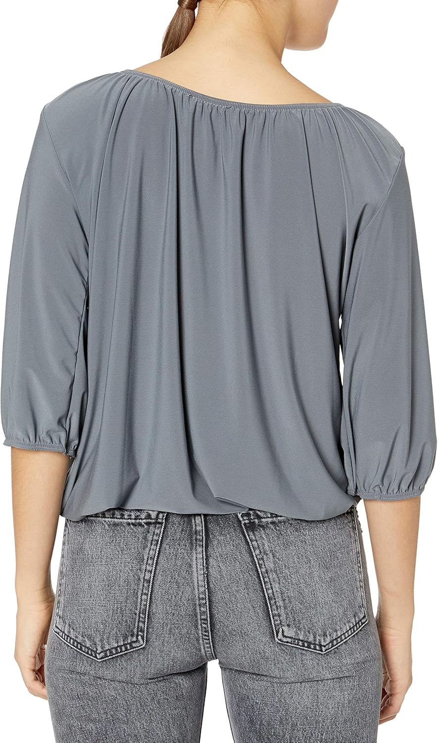 Update your wardrobe with this flattering peasant style top. Wear to work, Travel-friendly, comfortable and flattering in a soft and silky, wrinkle resistant knit fabric. 3/4 sleeve detail and elastic hem come together in a style that is easy to dress up pr down. Style details include flattering blouse that pairs well with denim and key hole tie neck design. This is the perfect piece to update your basic top collection.
