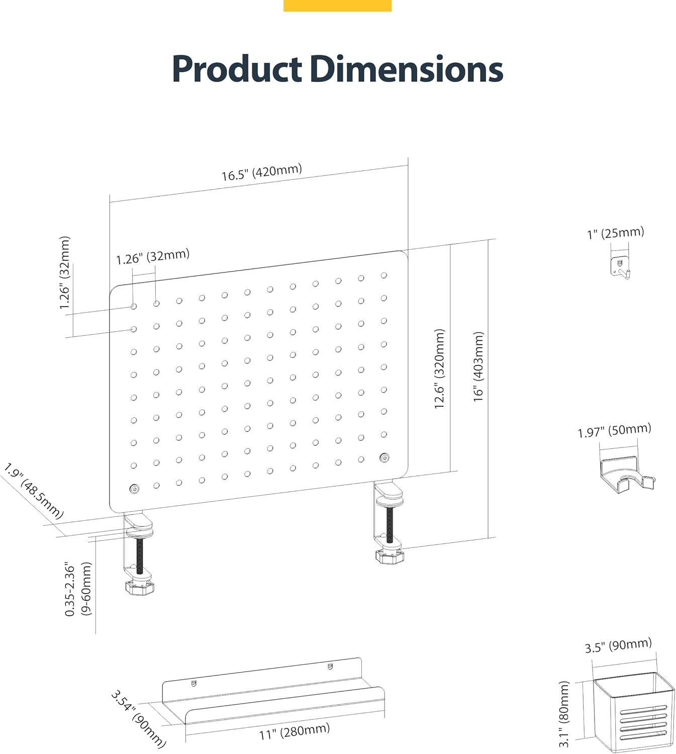 Maximize your desk space and streamline your workflow with this modular, clamp-on pegboard storage system. This desktop pegboard comes with everything you need to organize your workspace: 1x headset holder, 4x hooks, 4x magnets, 1x large shelf, and 2x pen boxes. The modular layout lets you rearrange components to adapt to your needs, making it ideal for keeping essentials within reach. The tool-free clamp design attaches securely to desks made of wood, metal, or glass (0.35-2.36in thick) without drilling or causing surface damage. Install it vertically, horizontally, or even upside down for maximum flexibility in tight or shared workspaces. Built from powder-coated steel, the 16.5 x 12.5in board resists scratches and wear while supporting accessories.
