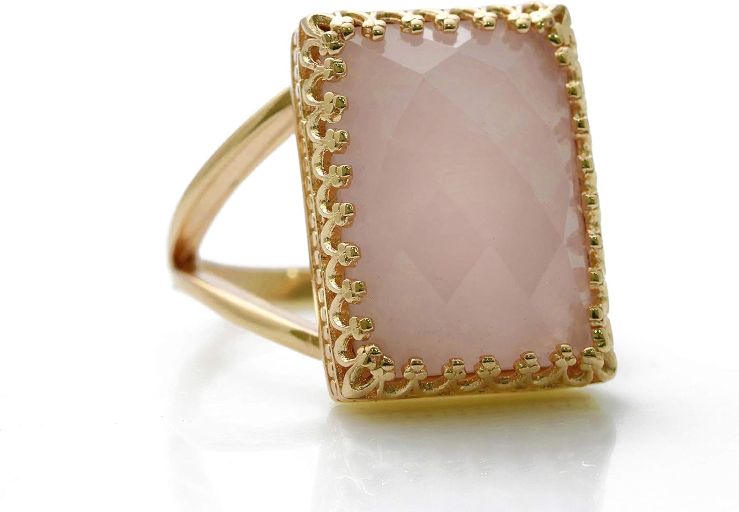 This adorable pink stone ring has a beautiful Rose Quartz in a beautiful crown-inspired setting with a customizable finish. A statement ring you can wear or can be a perfect gift for anyone who loves a touch of pink or someone born in January.