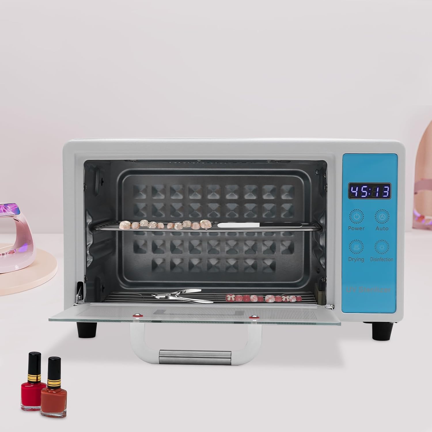 Details Tempered Glass Door Panel: Tempered glass is resistant to high temperatures and can effectively enhance the service life of the product. Practical Handle: It not only makes it easy to open the box door but also prevents your hands from getting burned. LED Display: It displays the drying time for your convenience so you can check at any time. Long Power Cable: The 3.28 ft power cable reduces usage restrictions and further protects your safety. Anti-slip Mats: They can effectively prevent the product from tipping over and keep the product stable. Specification Material: Galvanized Sheet, 201 Stainless Steel, Tempered Glass Color: Blue Process: High-temperature Baking Paint Assembly Required: No Mounting Type: Tabletop Display: LED Display Plug Type: US Standard Voltage: 110V Power: 160W Opening Angle: 125° Drying Temperature: 75℃/167℉ Capacity: 10L/10.57qt Power Cable Length: About 1m/3.28ft Product Size: 33.5*22*20cm/13.2*8.6*7.8in Package Size: 37*26.5*24.5cm/14.57*10.43*9.65in Gross Weight: 2.6kg/5.73lbs Net Weight: 2kg/4.41lbs Package Included 1* Nail Care Tools Drying Box 1* English Manual