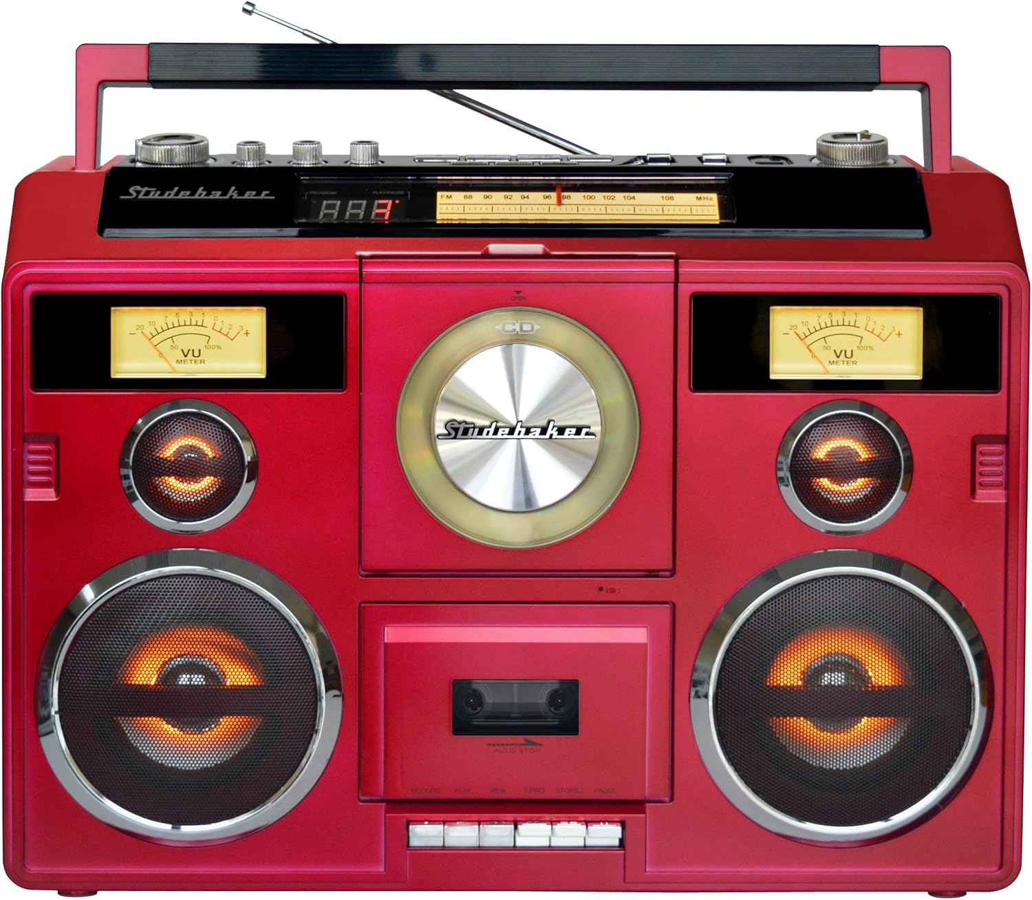 Reminiscent of the boomboxes of old, the SB2140R is a portable stereo CD Player/Cassette Recorder with AM/FM Stereo Radio and Bluetooth Receive (in) and Transmit (out). The front loading CD/MP3 Player is convenient and sounds great. Bluetooth in for streaming music or other audio and Bluetooth out for listening through wireless headphones. This unit comes with an auxiliary input jack and headphone jack as well as a USB port for playback from a flash drive. Record to cassette from the built-in microphone, radio, CD, USB, aux-in or Bluetooth. Other great features include built-in stereo speakers, 2 VU meters, rotary volume control, 4" speaker x 2, 1" tweeter x 2 and light effect that synchronizes with music on speakers and tweeters. Add 10 watts RMS output power plus AC/DC power including rechargeable battery and you get a feature loaded boombox in a retro design for the ages.