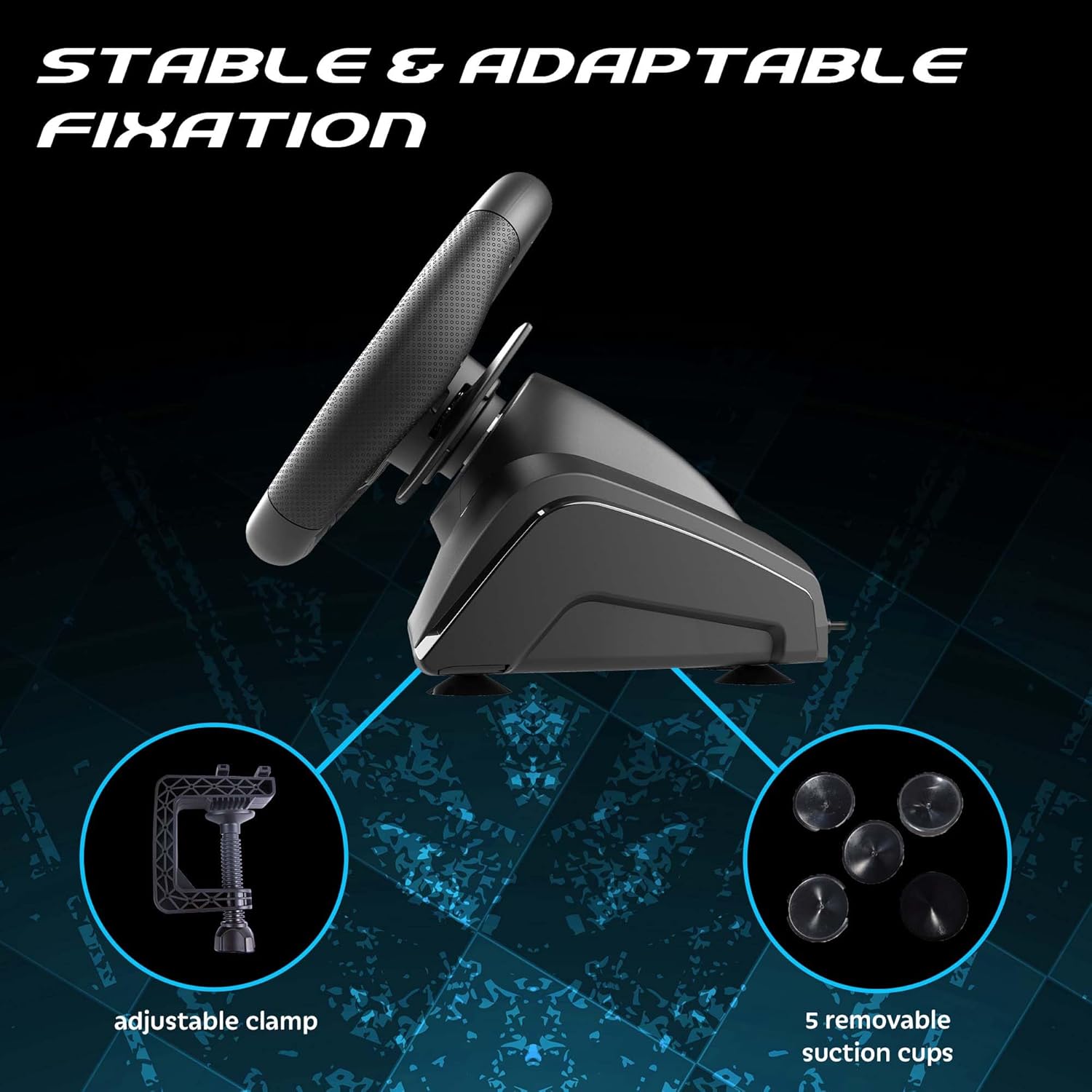 Immerse yourself in the most thrilling races with the Superdrive 270 GT-5 steering wheel, designed to deliver a realistic and accessible racing experience on PS5 and PC. It allows you to get the most out of the biggest simulation and arcade games such as Farming Simulator, Forza, Gran Turismo, and many more. With a diameter of 270 mm, micro-perforated leatherette grip, and 270° rotation, the 270 GT-5 offers a precise and comfortable grip. Its dual vibration motor faithfully reproduces the sensations of the road for full immersion. Designed for gamers, this steering wheel features dual right and left joysticks that put all the functions of a controller right at your fingertips. The programmable RGB LEDs around the sticks add a touch of excitement to your gaming sessions. The 270 GT-5 steering wheel comes with a full analog pedal set (brake and accelerator) equipped with a footrest for added comfort. Its integrated paddles allow for quick and intuitive gear changes, ideal for a sporty driving style. The LEDs on the top of the steering wheel are fully customizable to indicate acceleration, braking, or to create a unique racing atmosphere. With its programmable buttons and 3 sensitivity levels, it adapts to all types of races and drivers. For perfect stability, it comes with an adjustable clamp and removable suction cups, making it easy to install on a desk, table, or simulation cockpit. Finally, enjoy peace of mind with Subsonic's 2-year manufacturer's warranty