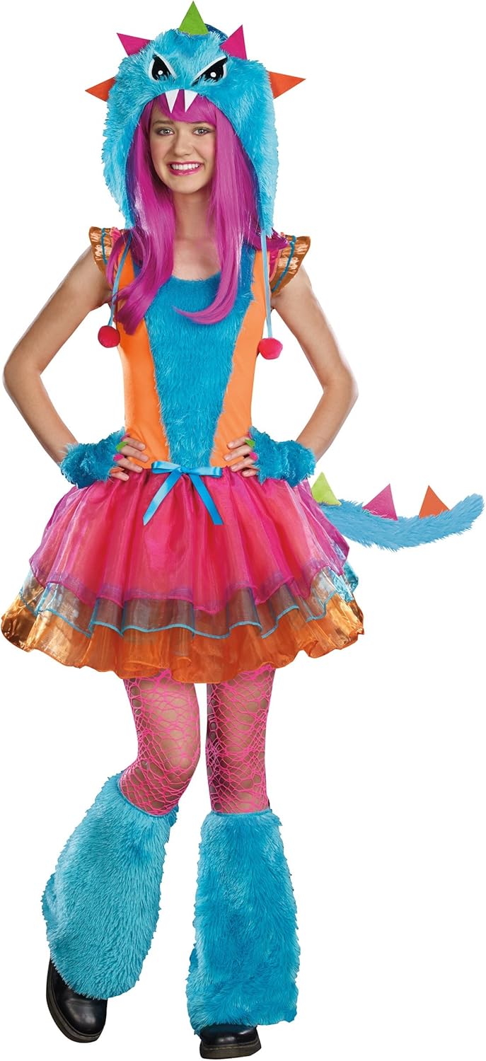 Fun dress with ruffle short sleeves, with a faux fur center front panel and triple ruffled skirt with attached monster tail. Faux fur monster hood with multi-color spikes and contrast colored pom poms. Includes faux fur fingerless gloves and boot covers (4 piece set).