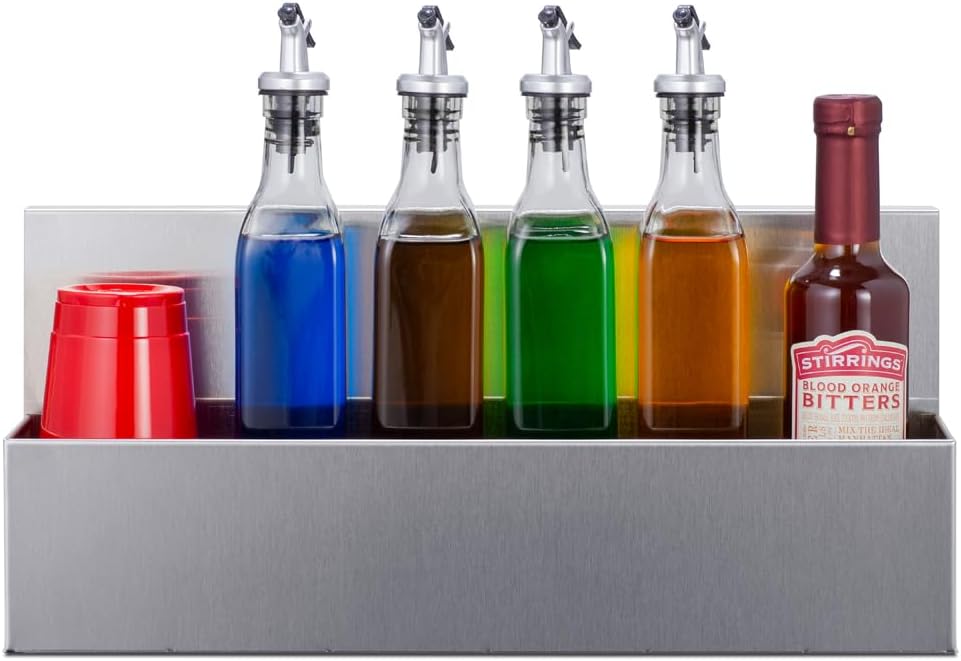 Summit Appliance SpeedRail 18 Inches Wide Single-Tier Speed Rail; Stainless Steel Construction; Weatherproof Design; Easy Compatibility; Velcro Strips IncludedSummit offers convenient accessories to keep your bar favorites within easy reach. Made in the USA, the Summit Speed Rail provides an elegant, efficient way of storing and displaying non-refrigerated bar extras for easy access by bartenders and waitstaff. Its complete weatherproof 304 grade stainless steel construction affords durability in an easy-cleaning design, perfect for busy commercial settings or outdoor home kitchensKey Features:304 grade stainless steel construction, Complete stainless steel construction offers added durability in an easy-cleaning designHook-style back, Designed for easy placement over a door frontWeatherproof design, 304 grade stainless steel holds up to outdoor elements18 inch wide, Provides ample storage space for bar favorites like mixers and liquorsVelcro strips, 2 horizontal velcro strips are included to tighten the fit as neededSpecifications:Material: 304 grade stainless steel constructionNumber of velcro strips: 2 (included)Used for: Wide enough to hold party cups, mixers, and other common bar extrasDimensions (HxWxD): 8.00 x 18.00 x 5.33 inchesShipping Weight: 20.00 pounds