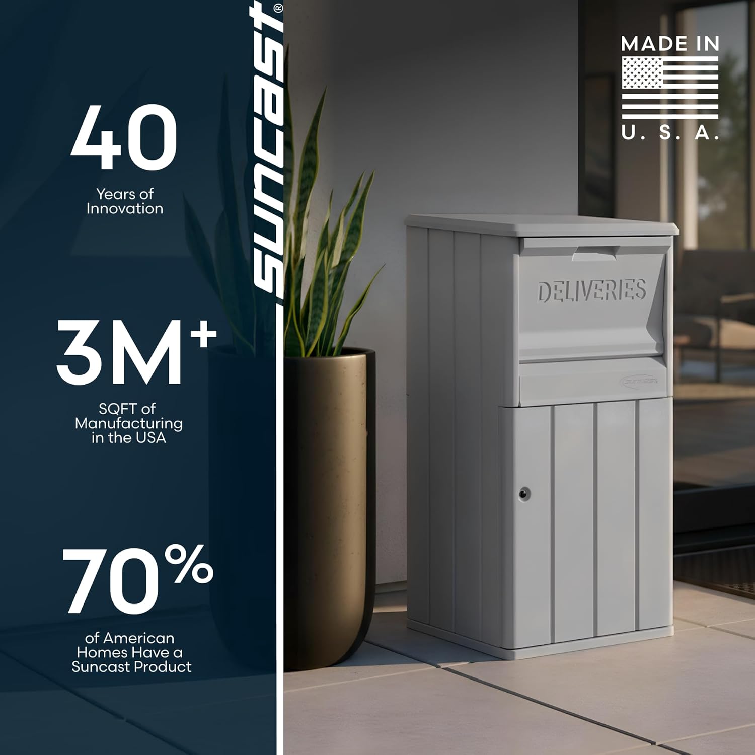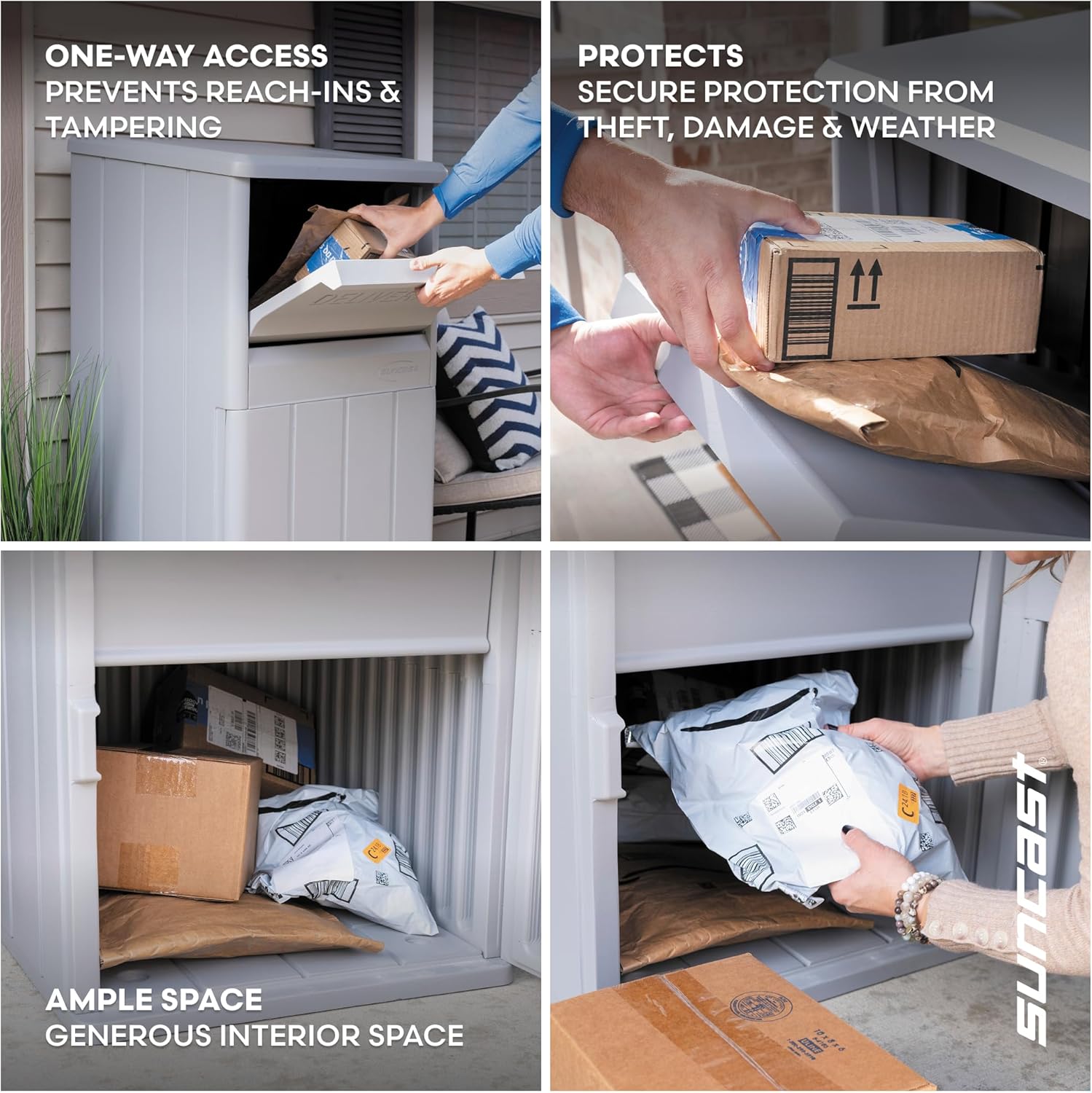 The Suncast Package Delivery Box is the perfect solution for homeowners seeking secure, contactless delivery storage. Constructed with heavy-duty resin panels, this anti theft package drop box offers exceptional durability and weather resistance, ensuring long-lasting protection against harsh outdoor elements like rain, snow, and UV rays. Its innovative one-way in-system allows packages to be placed inside without access to the storage compartment, providing peace of mind that only the owner can retrieve items using the included lock and key mechanism. With a spacious 33.5-gallon interior, this outdoor delivery box accommodates packages up to 14 in. x 18 in. x 8 in., keeping them safe from theft, damage, and weather conditions. Assembly is quick and easy with minimal tools required, and our drop box with lock is simple to clean using just soap and water. Designed with style in mind, this lockable storage box seamlessly blends with any porch décor, adding both functionality and elegance to your outdoor space. Made in the USA, it embodies quality craftsmanship and reliability. Unit can be anchored to floor if desired. Contact your local hardware store to determine the correct fasteners for your particular surface. If anchoring, 4 anchors are required, hardware not included.