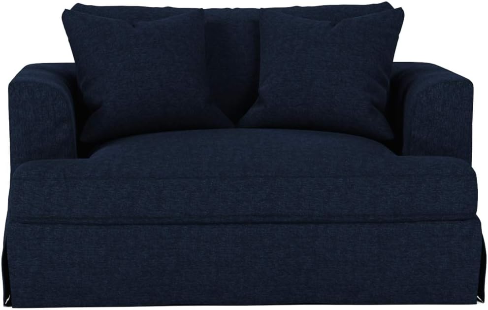 Sunset Trading Newport slipcovered T-cushion oversized armchair is designed for maximum comfort and durability. From your country family room to a seaside beach house, every living space can be updated in style with this chair and a half, featuring contemporary rounded recessed wedge arms for a designer look. The extra room provided by this deep seating large accent chair allows two people to snuggle comfortably, while single users have more space to spread out and relax on the gentle sloping curve of the padded shelter arms. Are your pets napping, kids playing and family hanging out eating and sipping on your living room furniture? You will love that this lounge chair is completely covered with removeable washable slipcovers which feature spill and stain repellent technology to keep the fabric looking clean, just wipe up spills with a paper towel. Comfy feather foam cushions are the same on both sides to flip and minimize wear and the two throw pillows can be used anywhere. Your search for ideas to update your home can end here when you pair with matching sofa, ottoman, and slipcovered dining chair.
