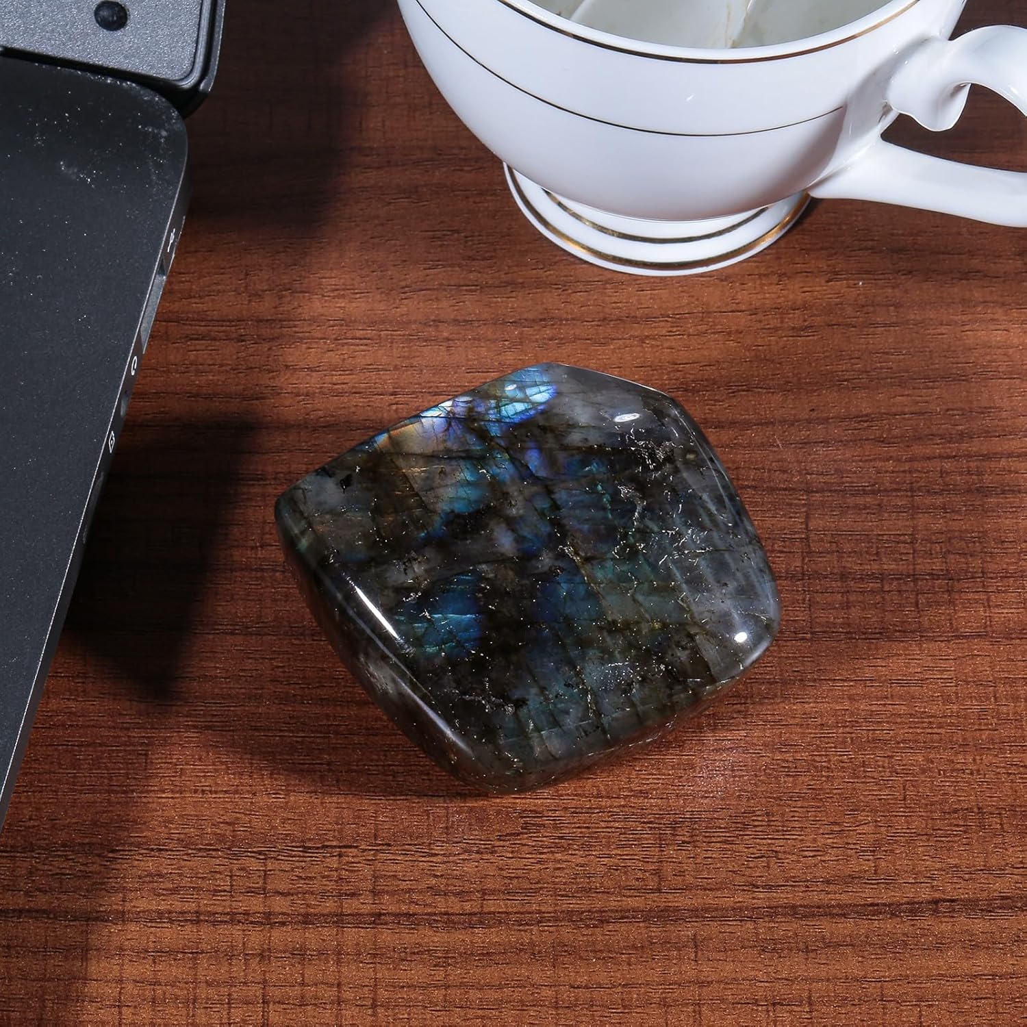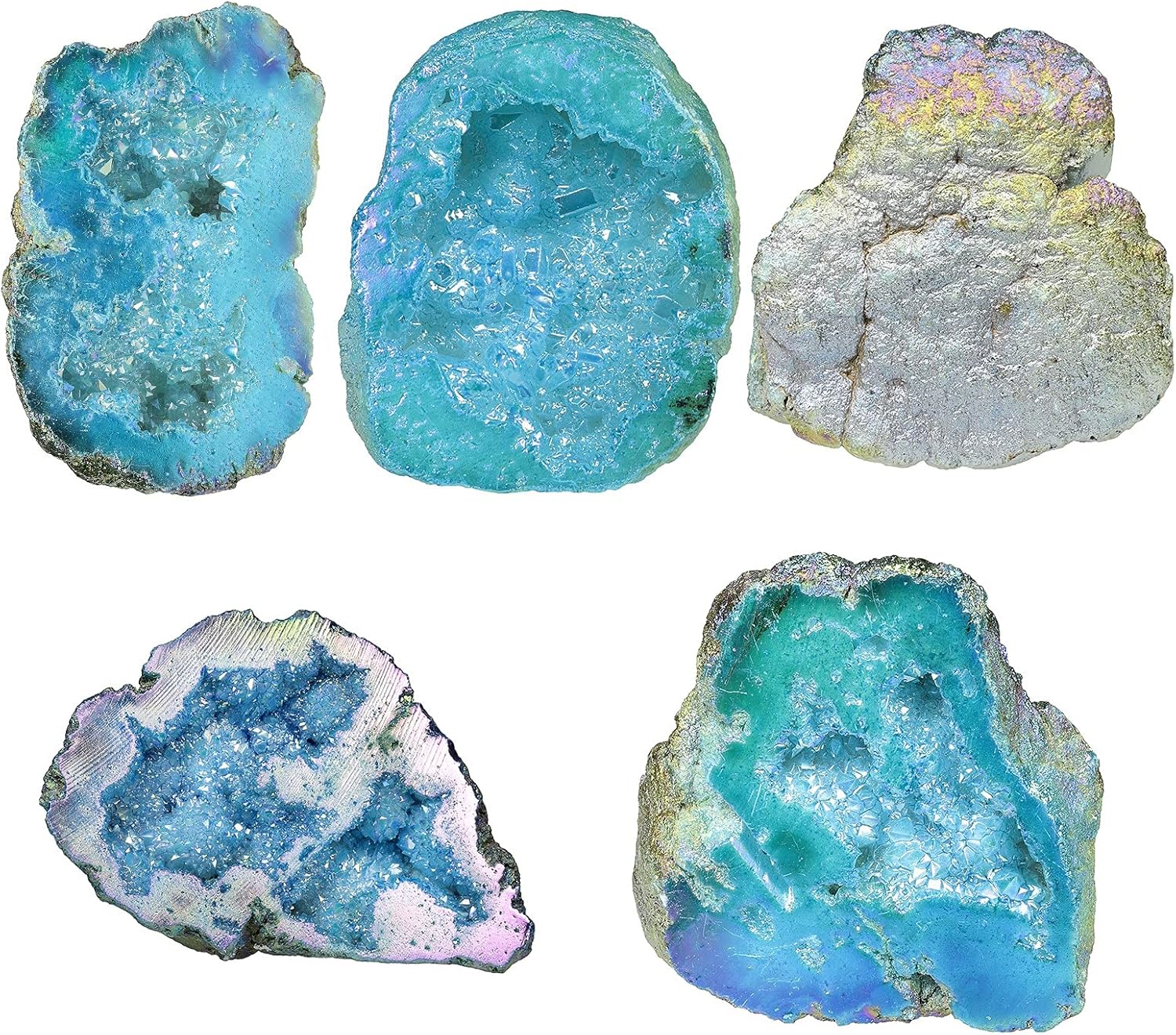 Bundle-item: Pack of 1 Irregular Rainbow Titanium Coated Geode Stone Decor, Pack of 1 Self-Standing Upright Labradorite Palm Stone. Titanium Coated Crystal Stone Geode: The crystal geode is made of natural rock quartz crystal which has been specially treated in a process where a molecular layer of titanium plus other metals has been fused to the surface of the quartz. This results in a permanent coloring of the surface creating a brilliant effect. Making the clusters look prettier and shinier than before. Self Standing Stone Lab Specimen for Desktop: The underside is after cutting, well for self-standing, some are polished while some are raw. Flat raw underside make the stone stand up on the desk. Placing an energy crystal stone as the feng shui decoration in you office or home desk can absorb the positive energy which comes from the crystal, keeping your place energy flowing.