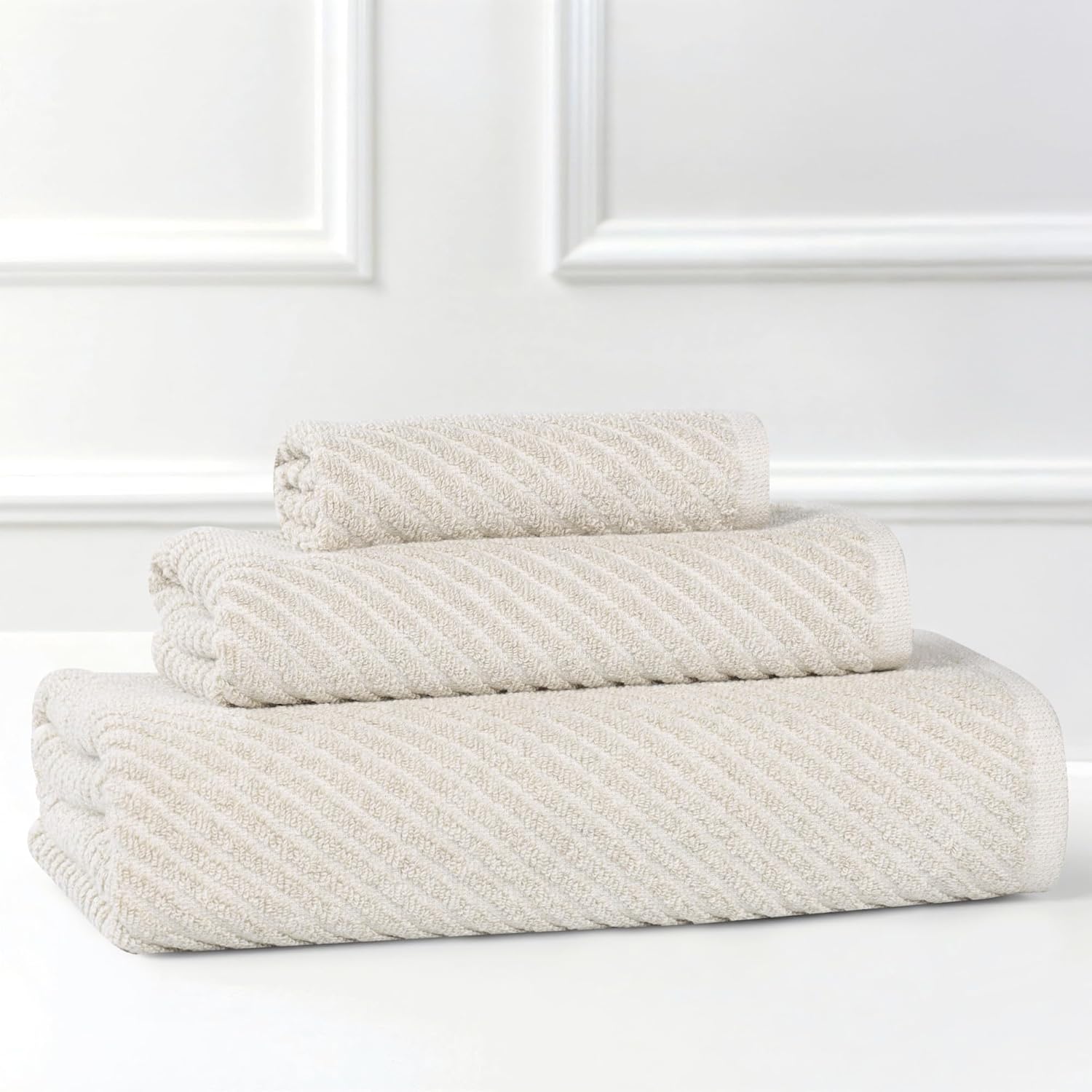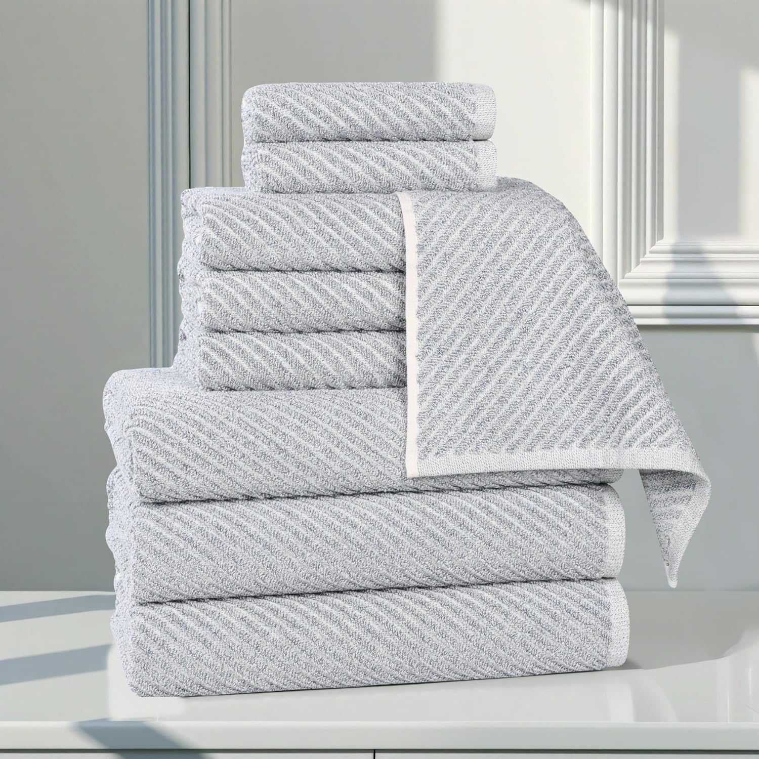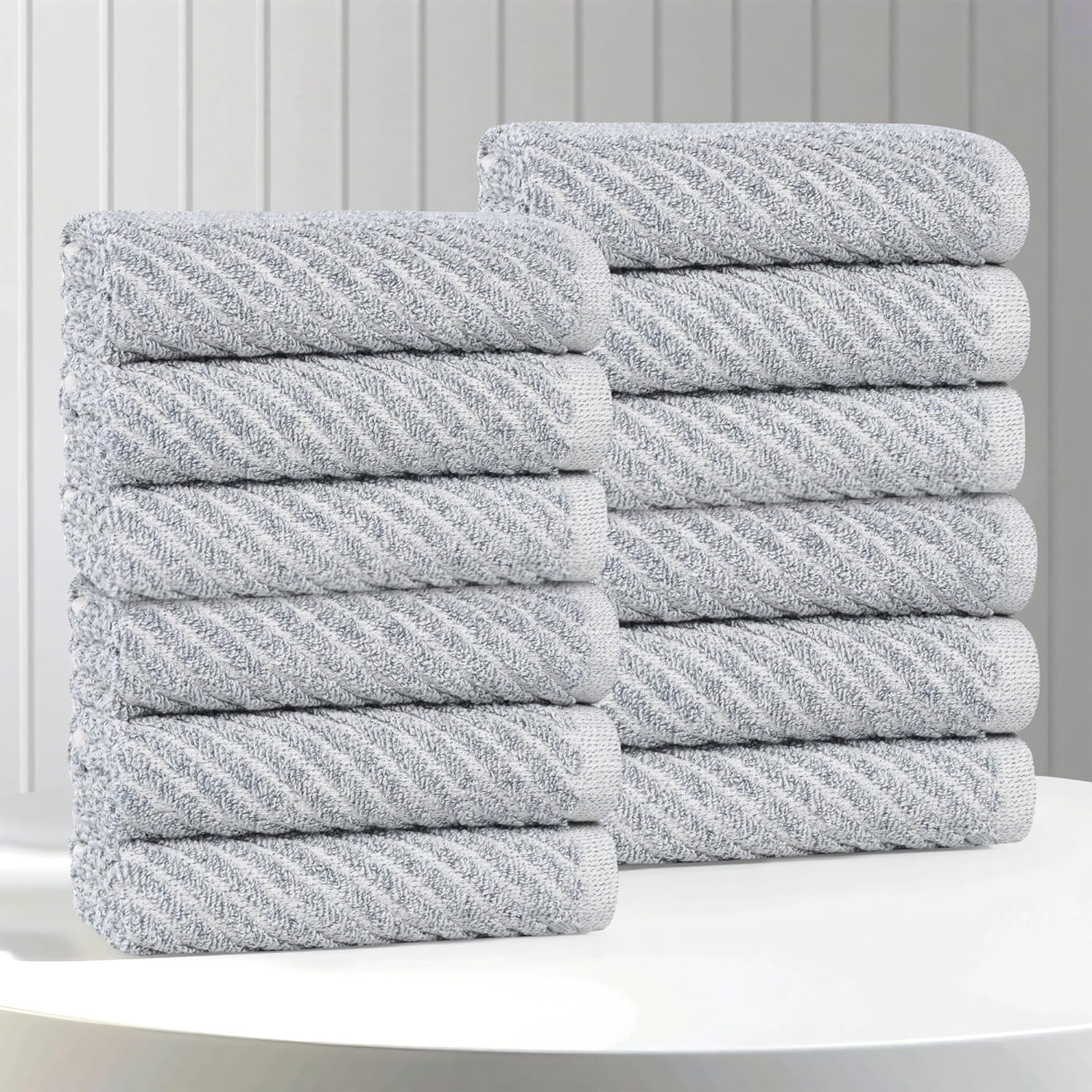 Make drying off a luxurious experience with the Superior Amelia Cotton Blend Face Towel Set. Crafted from an 80% cotton and 20% viscose blend, these towels feature a modern diagonal striped pattern that creates a unique and eye-catching look. This bundle artfully blends chic aesthetics with exceptional absorbency, ensuring a soft and gentle touch against your skin. The medium weight design is durable, moisture wicking, and quick drying, while the diverse palette of elegant colors allows you to personalize your bathroom’s aesthetic effortlessly.