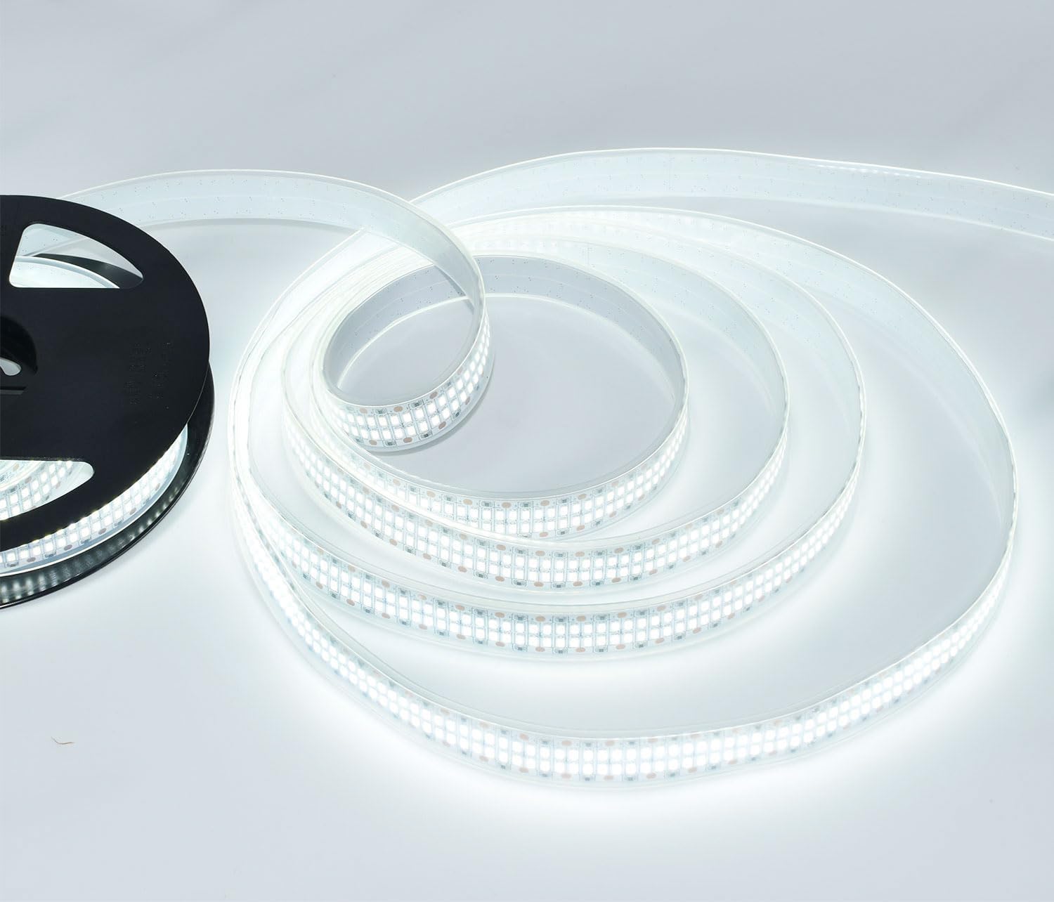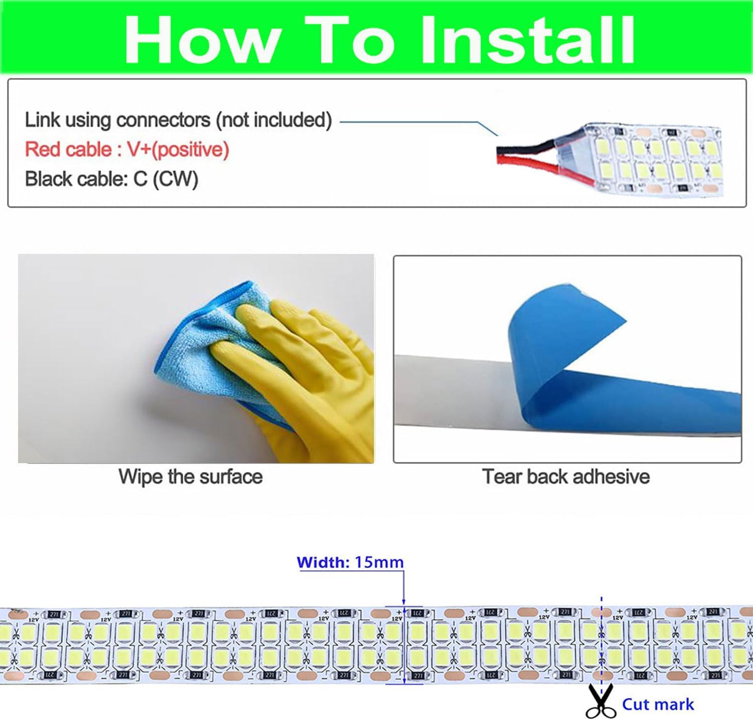 KIND TIPS:1. If this high tensity 2835 2400 LED Strip Light works flickering, please you change a bigger power supply, DC 12V 10A power supply is great choice!!2. This super bright dimmable 2835 2400 LED strip lights do not comes with a power supply, so you need extra purchase. Please you search ASIN: B0B6WRBK9K to buy if you need it.3. This super bright LED strip light can be dimmable, but dimmer is not included. If you need a LED dimmer switch, please you search ASIN: B0D9TQ2HG3 to buy it. Thank you very much!FEATURES:1. Super bright 2835 SMD LED, totally 52000LM, high intensity and reliability2. Long life span 50,000 hours3. Continuous length, packed with 5 meter4. Flexible ribbon strip for curving around bends5. Completely smooth and even light spread, solving the uneven luminous problem6. Ultra-bright but running at low voltage and low temperature7. Low power consumption, totally 57W / roll8. Every 6 LED cutable without damaging the rest stripSPECIFICATION:1. Size: 5000*15*3mm2. Emit Color: Cool White 6500K3. Protection Rate: Tube waterproof IP674. Working Voltage: 12V DC5. LED Quantity: 480LEDs / m, 5meter / roll6. View angle: 120 ° ~ 140 °7. Working Temperature: -20 °C to 50 °CFEATURED APPLICATION:1. Ideal for decoration of building outlines, landscape illumination, amusement themes2. Holiday light sculpture, decorative figure, active signs, displays, shop windows3. And storefronts, bar, nightclub, street, sidewalk, deck, park, porch, staircase, railing, ceiling, or drivewayPACKAGE INDLUDED:1 * 5m 2835 Led strip (not include any power supply, controller, and connector)