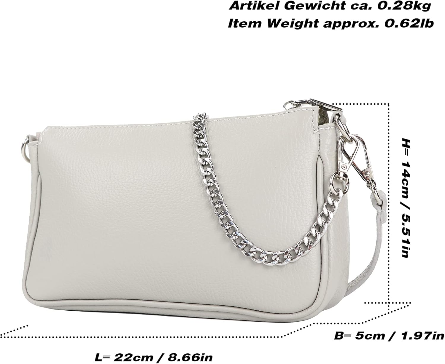 ! NEW MODEL ! Sporty small shoulder bag with decorative, removable chain and adjustable shoulder strap * soft leather in beautiful color variations * * Matching wallets available under modamoda P02 - P10 * Matching hip/belly bags available under modamoda T77 and T211 * Small bag can also be used as a clutch or cosmetic bag | closable with zipper | the main compartment is equipped with a side zip compartment | the silver-colored chain can be hung as a decoration or used as a carrying handle | The removable shoulder strap is adjustable from approx. 70 - 128 cm External dimensions of the bag approx.: length 22 cm | Width 5cm | Height 14 cm | Decorative chain approx. 49 cm length | Belt length adjustable from approx.: 70 - 128 cm | Weight approx.: 280 g modamoda de is a registered trademark.