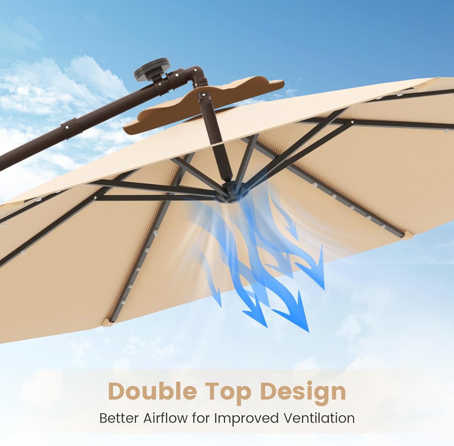 DescriptionHaving a good time outdoors with friends or family! Consists of a large 10 ft canopy, this useful patio sunshade umbrella provides a large shade area for your outdoor activity, to be specific, you can adjust the angle of the umbrella by adjusting the crank handle to avoid direct sunlight. In addition, the canopy made of high quality polyester fabric features water protection to keep you cozy. What’s better, 32 solar LED lights is fitted on the ribs to illuminate your night time activities. And you don’t have to worry about the stability of the umbrella, with the solid metal frame and 2 empty sandbags(each can be filled with 110 lbs sand), this umbrella is stable enough to withstand bad weather. Our offset umbrella will be a great addition to your outdoor decor!FeatureSandbag base is included in the product for stabilityThe tear-resistant canopy features quick drying and 20+ sun protectionWith 6h charging time, the solar led lights can provide continuous light at night8 sturdy steel ribs support large 10ft canopy firmlyEasily- to-operate crank handle allows you to easily adjust the canopyThe modern design umbrella can fit in well with your outdoor decorEquipped with wind vent to keep you cool on hot daysSpecificationColor: Beige/Tan/NavyMaterial: Polyester Fabric, Metal, Oxford FabricItem weight: 29 lbsDimension of the Umbrella: 10 ft x 10 ft x 8.2 ftDiameter of Canopy: 10 ftCanopy Height: 6.6 ftPackage includes:1 X Umbrella1 X Sand Bag1 X User Guide