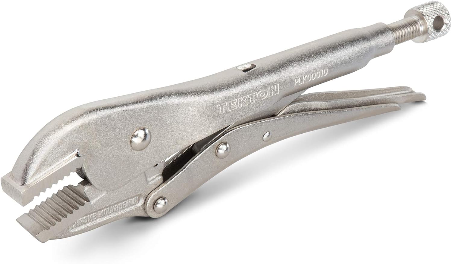 Tekton straight jaw locking pliers have wide and relatively short jaws that clamp and hold flat stock, L-angle, and sheet metal in position for welding or assembly. Deep, sharp, regularly spaced teeth offer an evenly distributed grip on smooth, flat surfaces. Easily set, release, and reposition the clamp with one hand and with more control than a traditional pinch-style lever. Get extra leverage and fine-tune your clamping force by inserting a screwdriver or hex key into the through-hole to create a T-handle. The jaws are made from 4140 chromium molybdenum steel, an alloy that offers toughness, machinability, and corrosion resistance. The teeth are hardened to 45–50 HRC and should not chip or strip even on fasteners up to Grade 8 or Class 12.9. The pliers have a durable, nickel-plated finish that protects against corrosion.