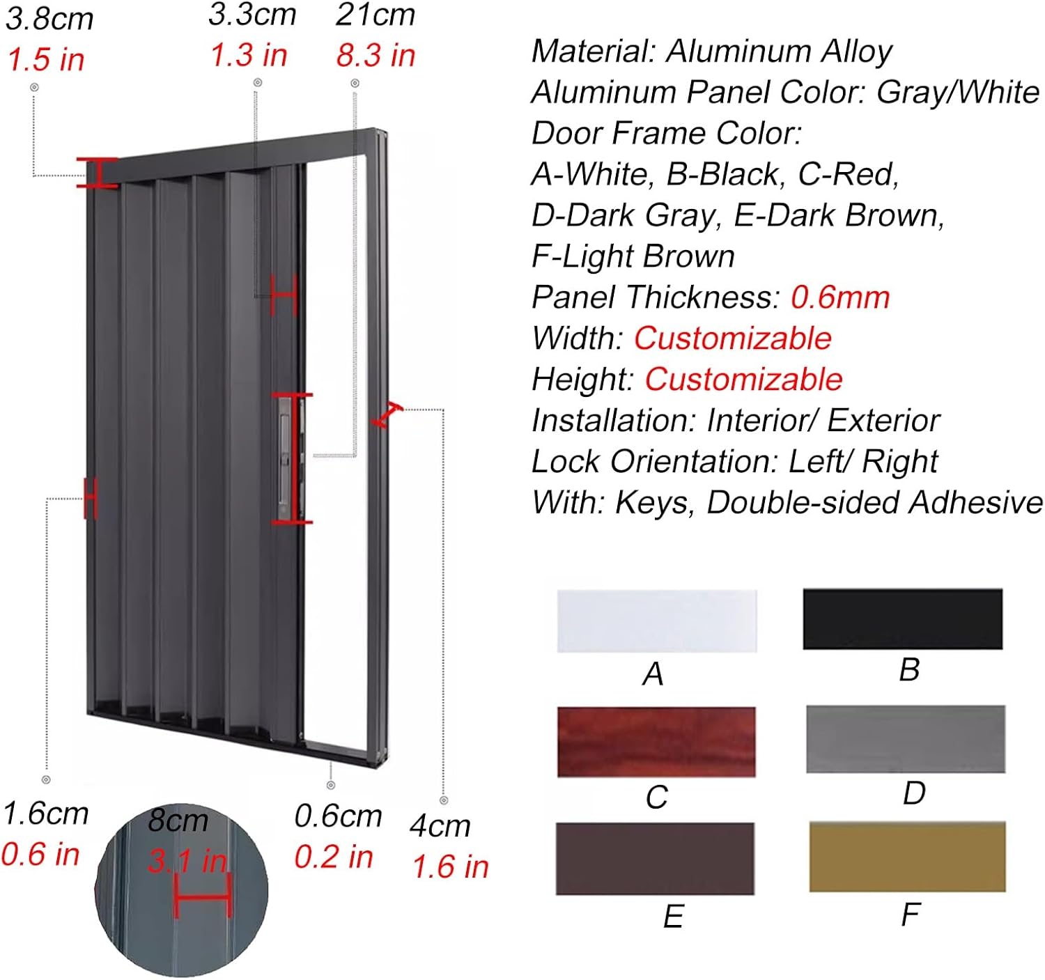 Metal Frame Indoors Security Patio Door:Transform your living space effortlessly with our versatile accordion door. Ideal for a variety of environments including living rooms, bedrooms, kitchens, and study rooms, this folding door not only enhances your decor but also provides essential separation and privacy. Designed with a space-saving approach, the accordion door folds neatly when not in use, maximizing your available area. This product is perfect for those looking to create distinct zones within their home or workspace without compromising on style. **Key Specifications:** - **Material:** Durable Aluminum Alloy - **Color Options:** Gray or White Aluminum Panel - **Panel Width:** 8 cm (3.1 in) - **Panel Thickness:** 0.6 mm - **Customizable Size:** Width and Height tailored to your needs - **Included:** Complete hardware kit for easy installation **Product Features:** 1. Effortless operation with easy open and close functionality. 2. Helps manage pet movement effectively. 3. Simple installation, cleaning, and maintenance make it user-friendly. 4. Perfect for use in pantries, hallways, offices, and balconies. 5. Efficiently blocks kitchen fumes from spreading. 6. Functions as a divider door, concertina gate, or screen. 7. Designed for compact spaces while ensuring privacy. 8. Equipped with alloy pulleys for silent and smooth operation, preventing jamming. 9. Provides full blackout insulation, keeping your space warm in winter and cool in summer. 10. Occupies only 10% of the space of traditional doors, making it a smart choice for small areas. 11. An excellent option for separating spaces such as bedrooms from bathrooms or kitchens from living areas. **Package Includes:** 1× Accordion Door **Please Note:** - Minor size discrepancies of 1-3 cm may occur due to different batches and manual measurements. - Color variations may arise from lighting conditions and display settings, so please refer to the actual product for accuracy. Upgrade your