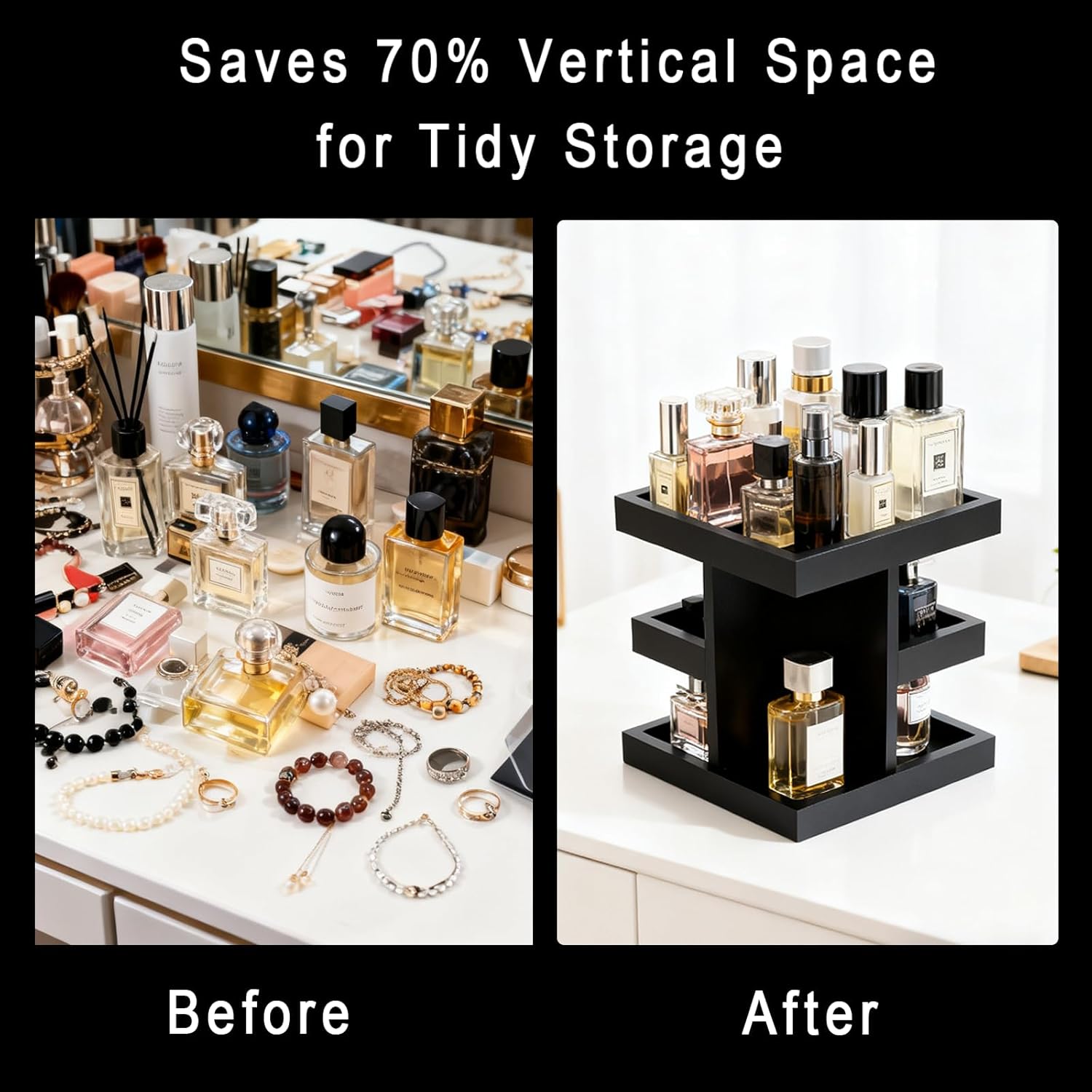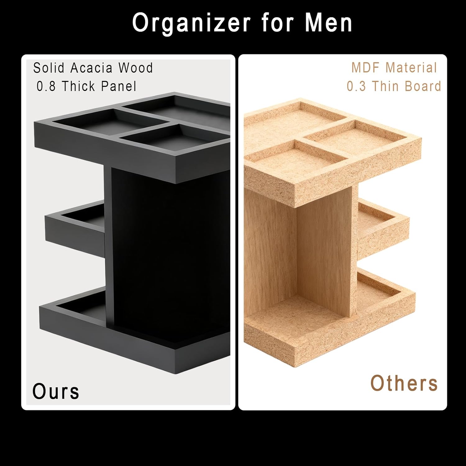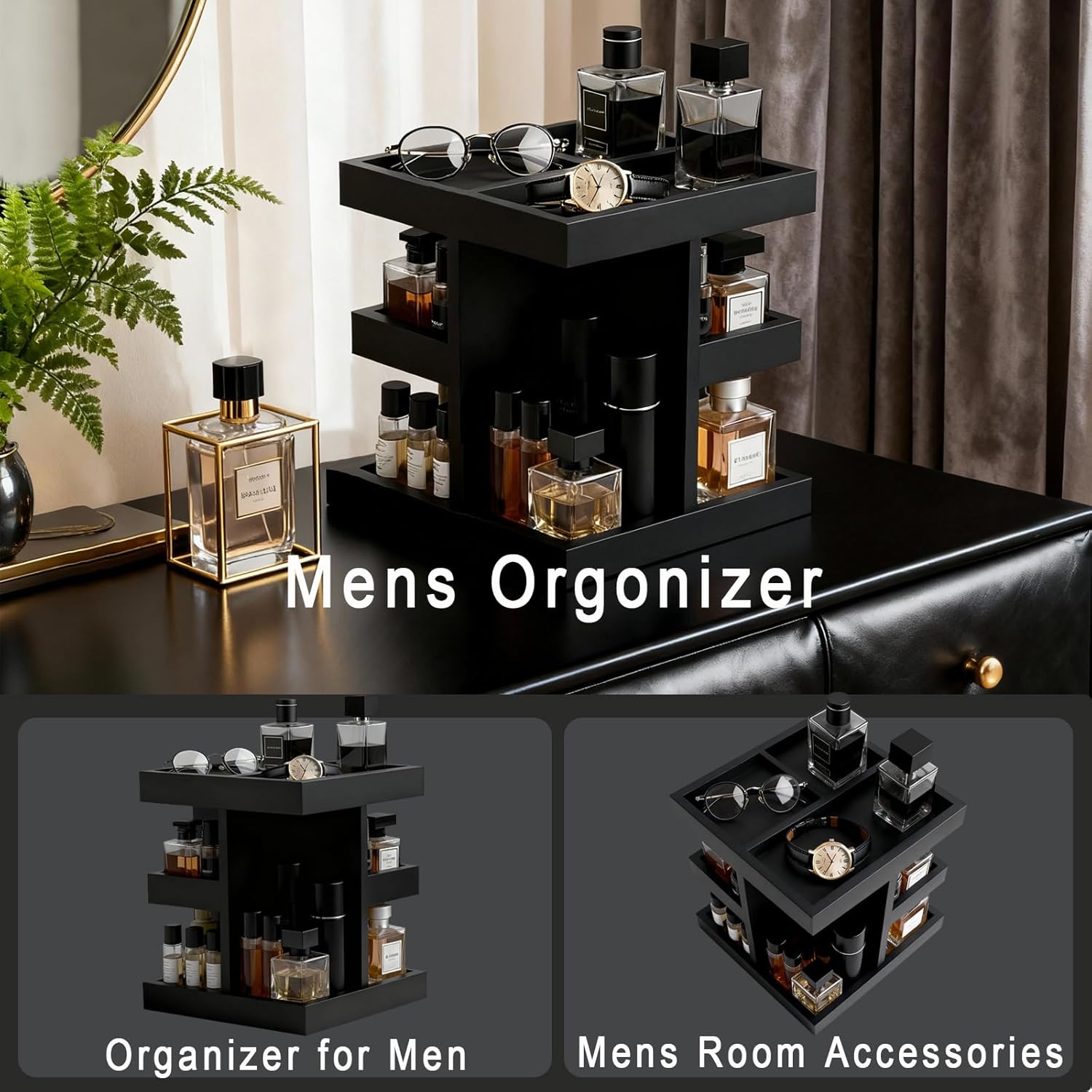 Elevate his daily routine with this sleek Cologne & Perfume Organizer for Men, a versatile storage solution designed to banish clutter and add sophistication to any space—whether on his desk, nightstand, bathroom counter, or vanity. Crafted from 100% natural high-quality pine wood with a warm, authentic grain finish, this organizer blends durability with timeless style, ensuring it complements modern minimalist, rustic, or traditional decor effortlessly. Its bold artistic silhouette doubles as decor while featuring a 360° rotating base for instant access to favorite scents and a multi-tiered layout with 9 compartments (3 shelves) that neatly houses colognes, perfumes, watches, keys, razors, or jewelry—accommodating items up to 3.5” tall to eliminate messy stacks. Perfect for men who value organization, this piece isn’t just storage: it’s a statement of refined living. Ideal as a gift for men—whether for birthdays, Father’s Day, Valentine’s Day, or housewarmings—it delights perfume lovers, grooming enthusiasts, or anyone seeking a touch of practical elegance. Use it as a desk organizer to streamline mornings, a nightstand organizer for men for bedtime access, or a bathroom counter organizer to keep essentials tidy; it even doubles as a vanity organizer for skincare or cologne accessories, making it a must-have for his bedroom, bathroom, or home office. Measuring 11.81″H x 7.87″D x 3.9″W, its compact size maximizes space without sacrificing capacity. Backed by our 24-hour satisfaction guarantee, this organizer combines function, artistry, and thoughtfulness—proving that organized living can be stylish.