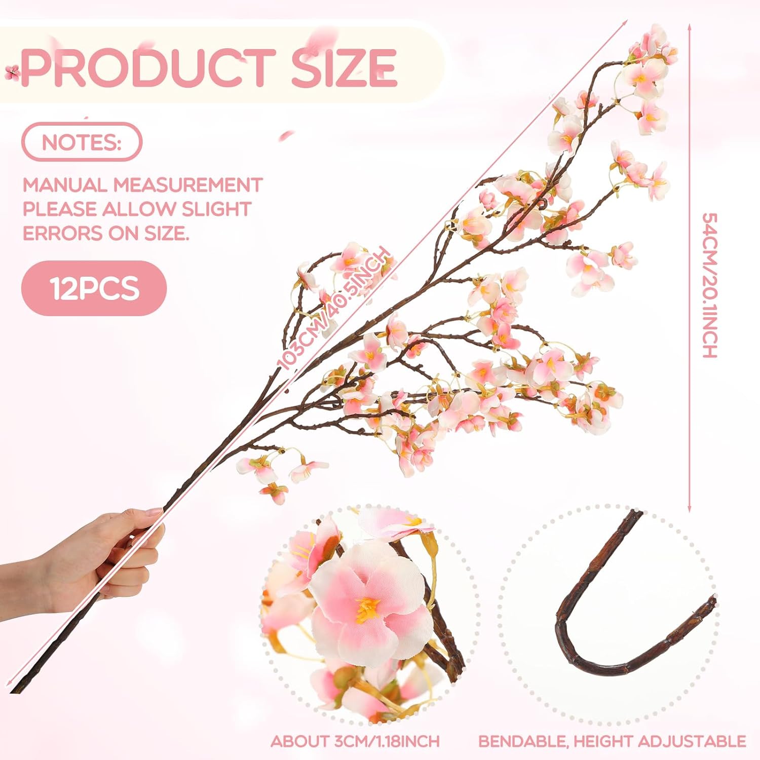 Features: Tips: Flowers may be scattered in the process of delivery, you only need to gently insert them back, and the shape of the flower looks very natural and lifelike. Nice gifts: Our artificial cherry blossoms are sufficient in quantity and beautiful, making them ideal gifts for friends, family, people who have just moved into new homes, or newly married couples. Specifications: Material: silk cloth and plasticColor: as pictures showSize: Total length: approx. 40.5 inchesFlowered part length: approx. 21 inchesDiameter of flower: approx. 1.2 inchesPackage includes: 12 x Artificial cherry blossom branchesNotes: Manual measurement, please allow slight errors on size. The color may exist a slight difference due to different screen displays.