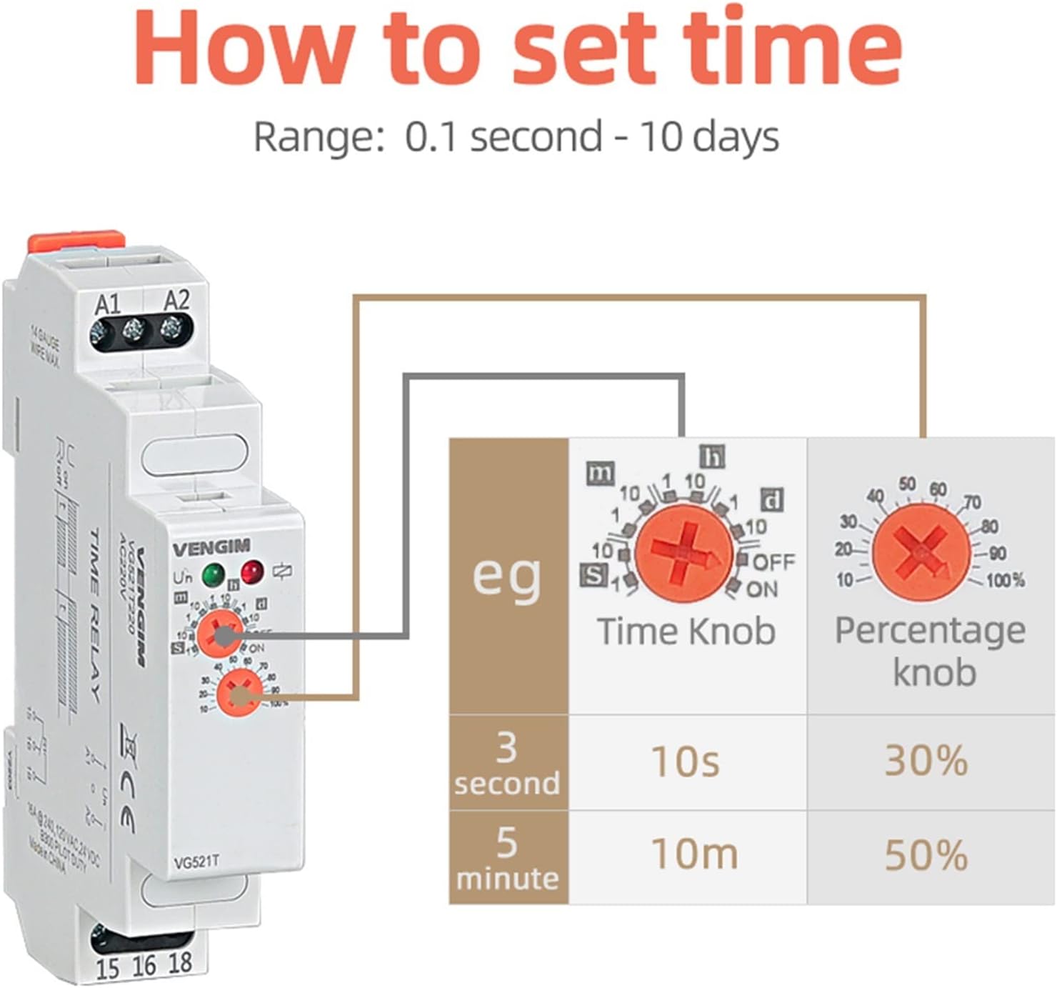 relayPower Delay Relay, Time Relay 220v, Timer Relay 220v, Power On Delay RelayRelay type:On Delay Time RelayFunction Description:The timing period "t"begins on energisation. After timing, the output "R"close.Technical data:Rated supply voltage:220 VAC or 12-240 VAC/DCSupply frequency: 50/60 HzTime delay range:0.1 Second - 10 DaysOperating temperature:-20~+55Storage temperature:-30~+70Setting accuracy-full range:±5%Contacts type:1 C/O (SPDT)Rated current:5A/240 VAC,24 VDC (Resistive Load)Discrete Output Type:RelaySize:Width (18mm) × Depth (65mm) × Height (90mm)Applications:Automatic door and gate openers, building automation, cranes, pump controlpanels and pumping units, automated awnings, blinds, shutters, elevators,control systems, timers and lighting controls.Delay time adjustable on front by rotary switch: 10...100%Green LED indicator for power onRed LED indicator for relay state; flashing for delay and steady when relay energised"Blade + cross" both flat blade and crosshead screwdrivers can be use on rotary selectors and terminals35 mm Din rail mount