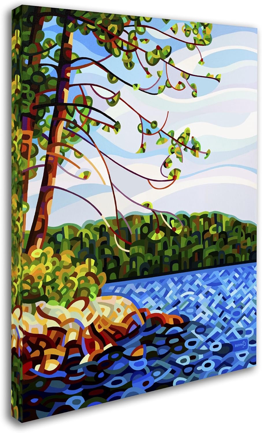 This ready to hang, gallery-wrapped art piece features an abstract painting of a tree next to a pond. Mandy Budan began studying art in high school and advertising design in college. Mandy worked for many years as a graphic designer in both print and digital media. Always fascinated by the vibrant colors and shapes that make up the Canadian landscape, Mandy started painting in 2000. She works with acrylic paint on wood panels, she works to transform the landscape into a series of abstract patterns. Her work is in private and corporate collections around the world. Giclee (jee-clay) is an advanced printmaking process for creating high quality fine art reproductions. The attainable excellence that Giclee printmaking affords makes the reproduction virtually indistinguishable from the original piece. The result is wide acceptance of Giclee by galleries, museums, and private collectors. Gallery wrap is a method of stretching an artist's canvas so that the canvas wraps around the sides and is secured a hidden, wooden frame. This method of stretching and preparing a canvas allows for a frameless presentation of the finished painting.