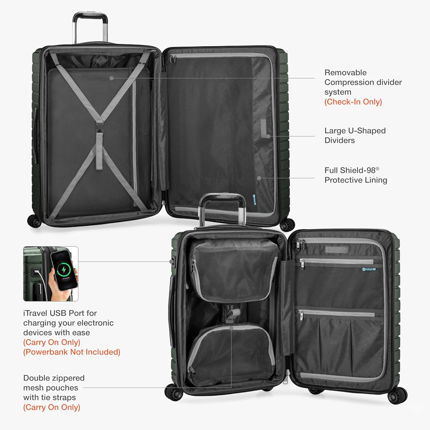 Product Description Traveler's Choice's Archer collection combines durability with convenience. This collection is made of 100% polycarbonate hardshell for maximun durabilty and construction. The abrasion resistant diamond cut pattern makes it long lasting and is designed to strengthen the construction to withstand the rigors of travel. Offers a modern feature with the Shield-98 technology that protects the interior lining of the luggage. Includes our Patented 360 degree Dual Cyclone Spherical spinner wheel system that provides a wide wheel base for better traction and stability and a push-button telescopic handle system with a self-locking mechanism. The 21” carry-on luggage spinner includes a USB Port for charging your electronic devices on the go. From the Manufacturer Traveler's Choice's Archer collection combines durability with convenience. This collection is made of 100% polycarbonate hardshell for maximum durability and construction. The abrasion-resistant diamond cut pattern makes it long-lasting and is designed to strengthen the construction to withstand the rigors of travel. Offers a modern feature with the Shield-98 technology that protects the interior lining of the luggage. Includes our Patented 360-degree Dual Cyclone Spherical spinner wheel system that provides a wide wheel base for better traction and stability and a push-button telescopic handle system with a self-locking mechanism. The 21” carry-on luggage spinner includes a USB Port for charging your electronic devices on the go.