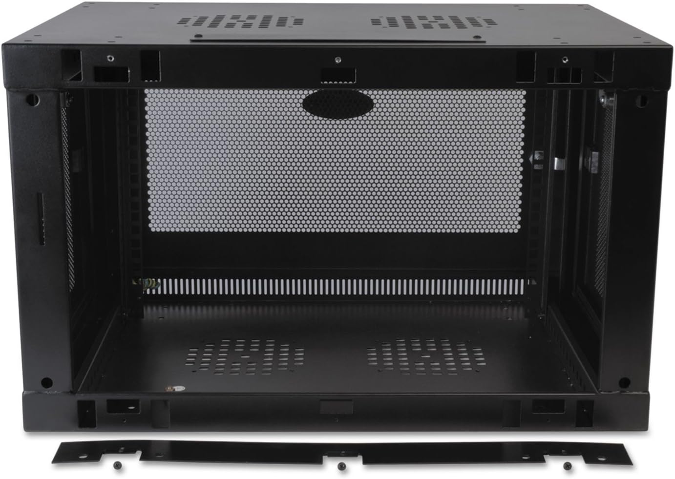 The 6u wall mount rack enclosure rackcabinet w/ door and side panels. SRW6U wall mount rack enclosure cabinet package includes 12 M6 screws, 12 M6 cage nuts, 12 M6 cup washers, 12 12 to 24 screws, removable mounting plate, 3 mounting plate screws, 2 Keys.