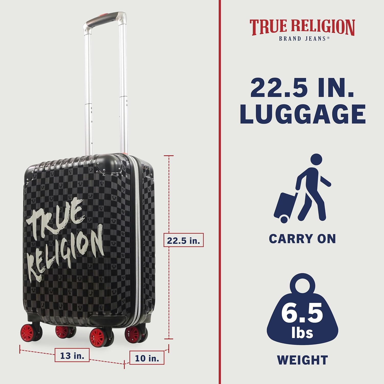 Give the perfect gift to travelers with our stylish True Religion Luggage. This cool hardshell luggage features a sleek checkered pattern with bold "True Religion" branding and is designed to meet most airline carry-on requirements, fitting into most overhead bins. The spacious, polyester-lined main compartment is divided for easy packing, with double zippers, an interior mesh zip pocket, and compression straps to keep clothes wrinkle-free. A 2-inch gusset provides additional storage expansion. The lightweight, durable design includes eight 360-degree spinner wheels and a retractable top handle for effortless travel, along with a top carry handle for easy loading. The hard shell is made from polycarbonate and ABS plastic, ensuring your belongings stay protected. Officially licensed True Religion product. Dimensions: 22.5 H x 14 W x 10 D inches, weighing 6.5 lbs.