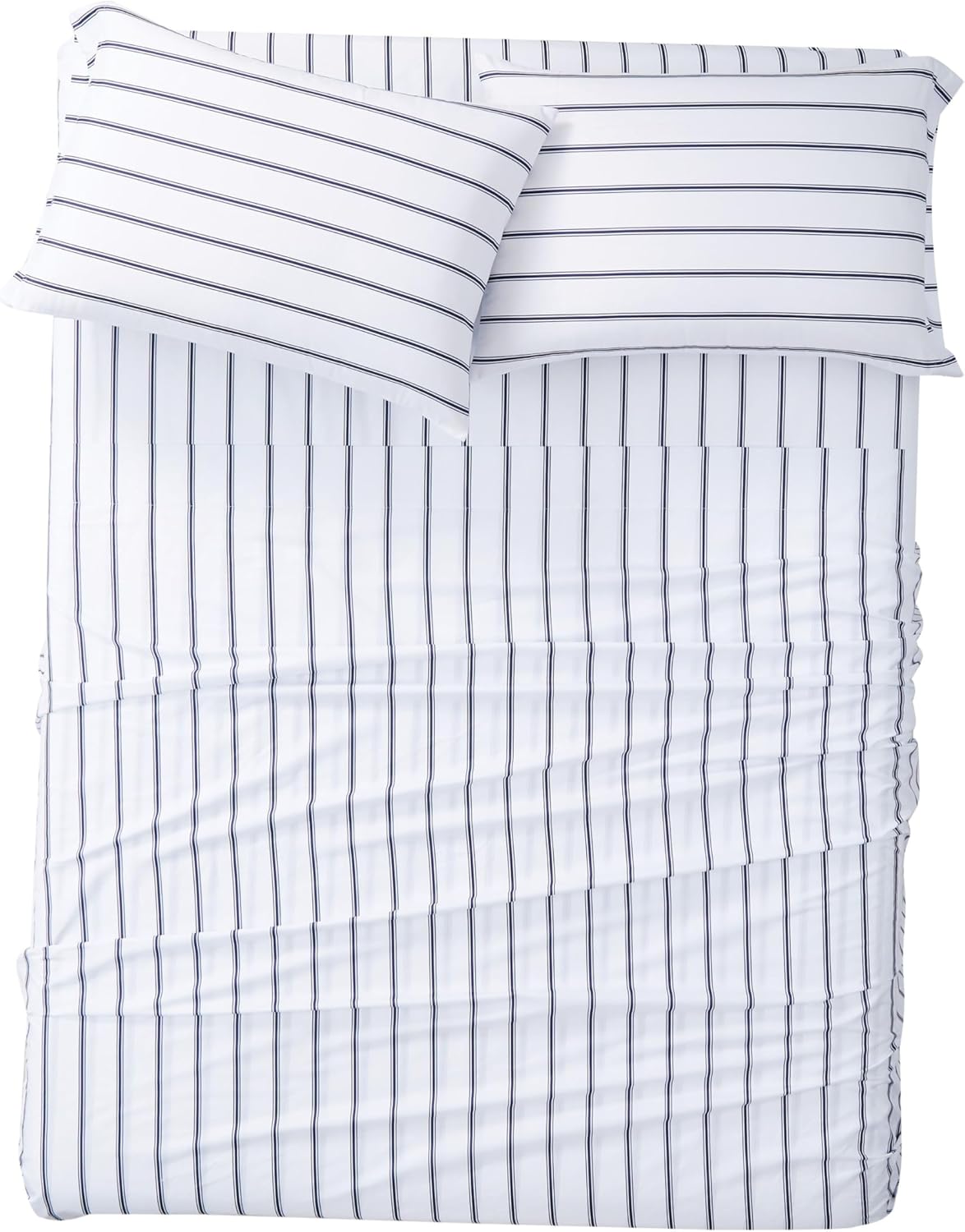 Classic and clean stripes in a standard ticking stripe pattern are a great addition to your bed. The pattern uses a white base with a wider spaced stripe featuring a three stripe pattern with two smaller stripes surrounding a thicker middle stripe. Simple stripes can help you pull together different looks, or they can be used to bring life to an all solid bed. This collection features deep pockets to fit thicker mattresses.Includes one fitted sheet (78x80 inches) with 13 inch pocket to fit up to a 15 inch deep mattress, one flat sheet (108x102 inches), and two pillowcases (20x40 inches)Each item in the set is made from 100% microfiber polyester yarns in a percale weave and printed.This item is machine washable, but care should be taken to wash in appropriate size equipment to avoid damage.This item is imported from China.