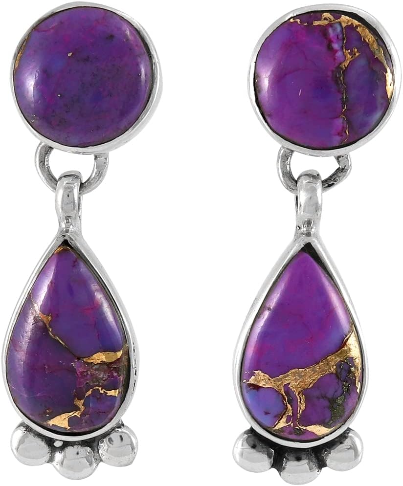 Adorable teardrop dangle earrings made of solid 925 Sterling Silver and genuine gemstones - with an exciting Southwest flair! Amazing craftsmanship. About 1" long (see ruler images for size/dimensions).Note: Due to the nature of these gemstones, variations in colors/shades/matrix and imperfections are normal. Our turquoise and coral have been stabilized, treated, and color-enhanced for beauty and durability.Imported