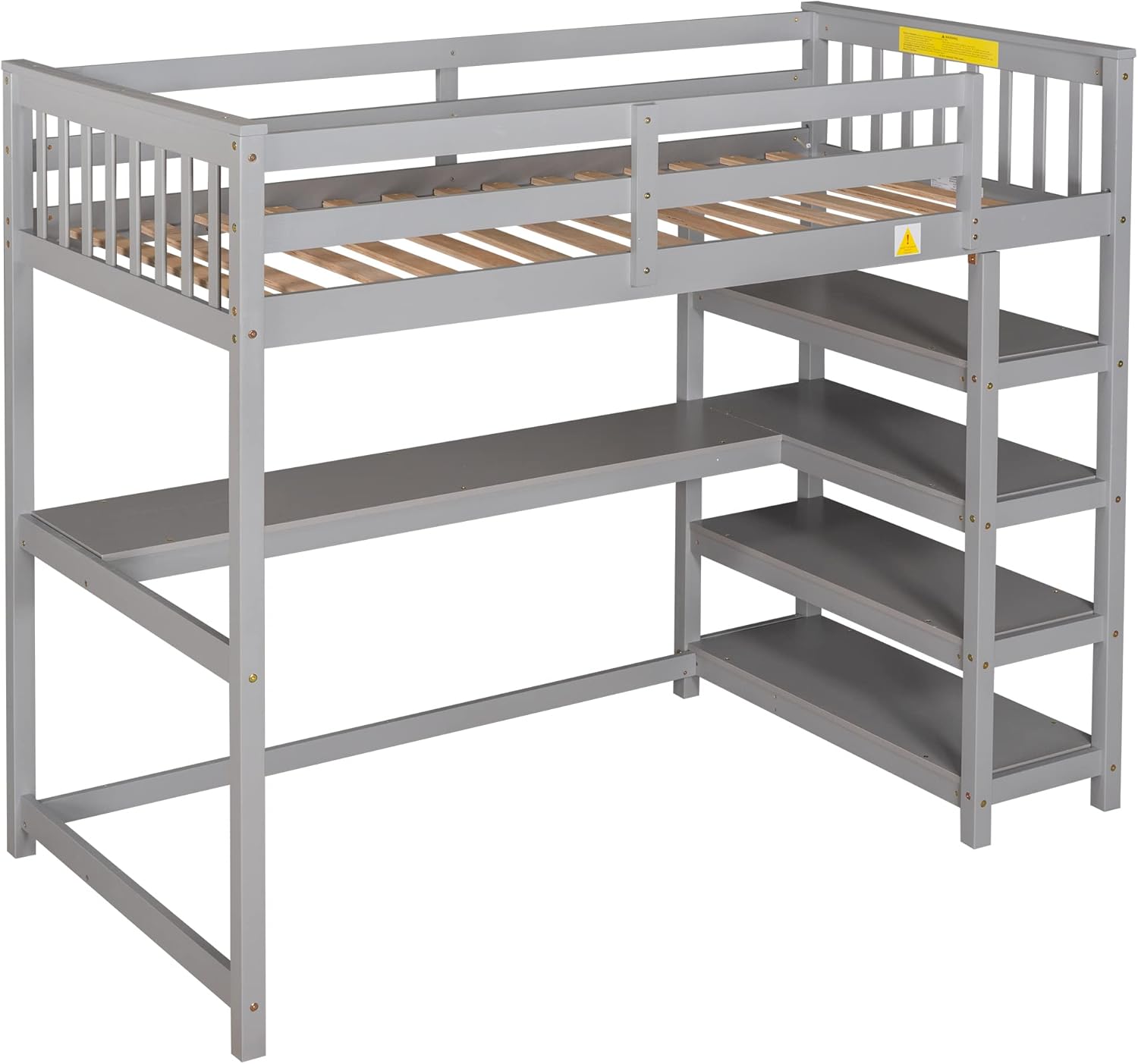 Create the ultimate sleep and study zone with this Twin Size Loft Bed with Under-bed Desk and Storage Shelves, designed to help you stay organized and maximize every inch of your space. With a stylish gray finish and clean lines, this loft bed fits seamlessly into modern, minimalist, or transitional décor styles. Made from solid pine wood and durable MDF, the bed frame offers a sturdy sleeping platform supported by 14 slats—no box spring required. The built-in desk and multiple open shelves beneath the loft provide ample space for homework, reading, gaming, or crafting. The side shelf unit doubles as a ladder, ensuring both accessibility and function. Perfect for teens, students, or kids, this loft bed is the ideal space-saving solution for apartments, dorm rooms, or small bedrooms. With thoughtful design and durable construction, this all-in-one furniture piece brings comfort, productivity, and style to your space. Product Specifications: Material: Pine Wood + MDF Color: Gray/Espresso/White Size: Twin Overall Dimensions: 79.7"L x 42"W x 68.3"H Bed Platform: 76"L x 39.2"W Weight Capacity: 250 lbs Number of Slats: 14 Recommended Mattress Thickness: 6" Product Weight: 137.5 lbs Spring Box Needed: No Number of Packages: 2 Assembly Required: Yes This loft bed combines sleep and study in one functional unit—perfect for modern family life or minimalist living.