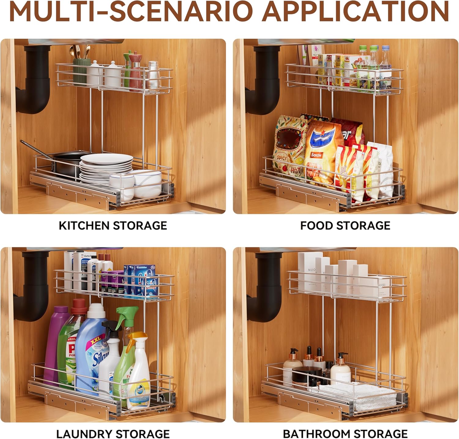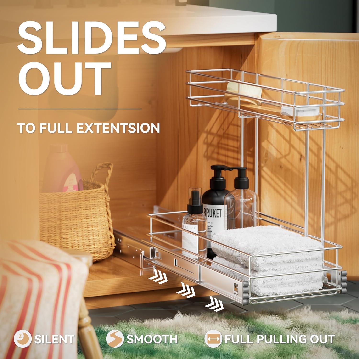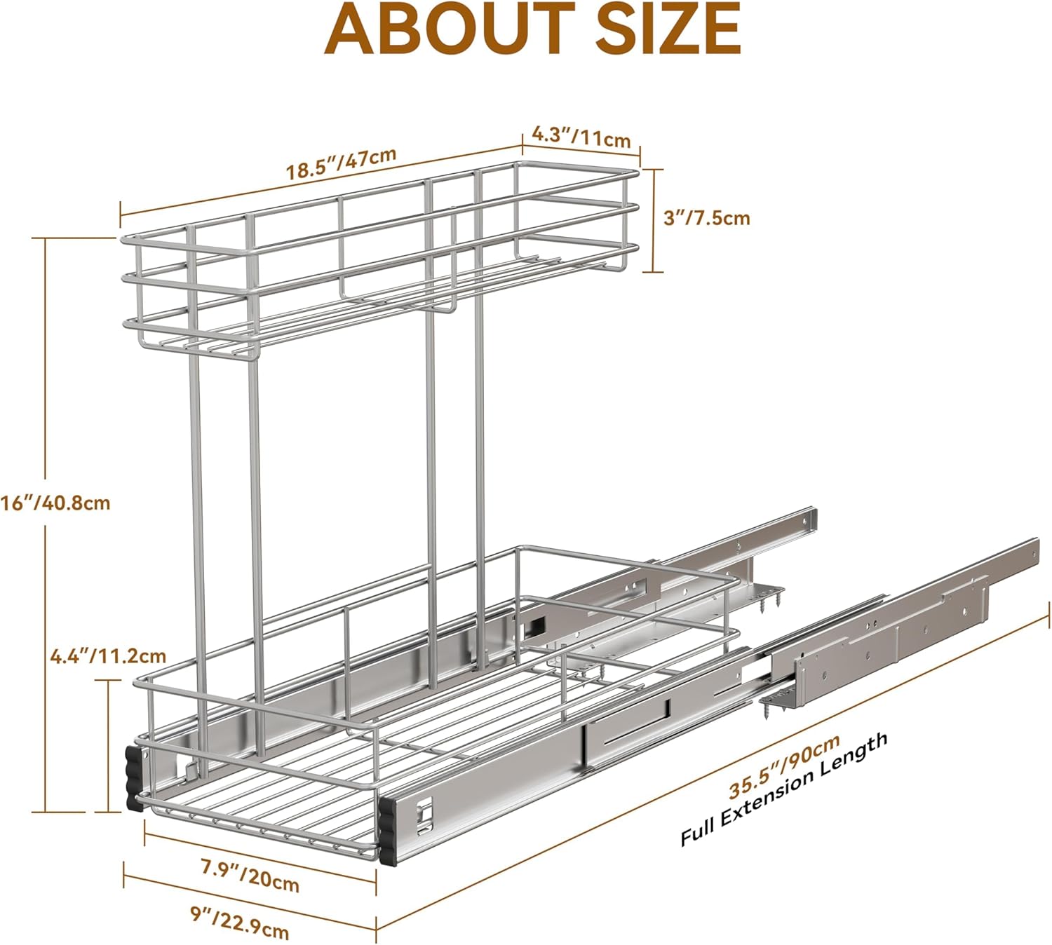 Under Sink Organizer 9"W X18.5"D,Pull Out Cabinet Organizer 2 Tier,Under Sink Slide Out Organizer Chrome Plated, Under Kitchen Bathroom Sink Organizer, Pantry Cabinet Closet Organization Rack, 1 Pack