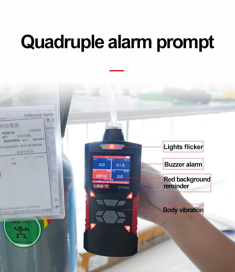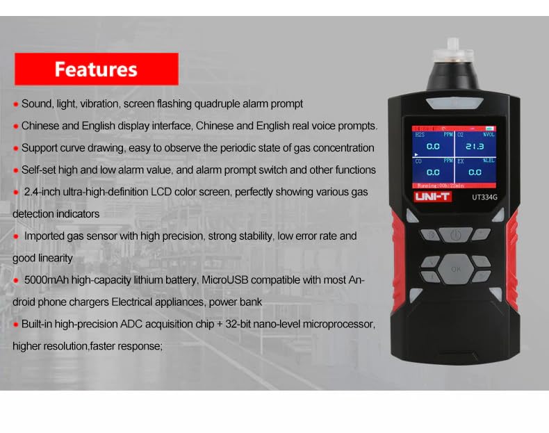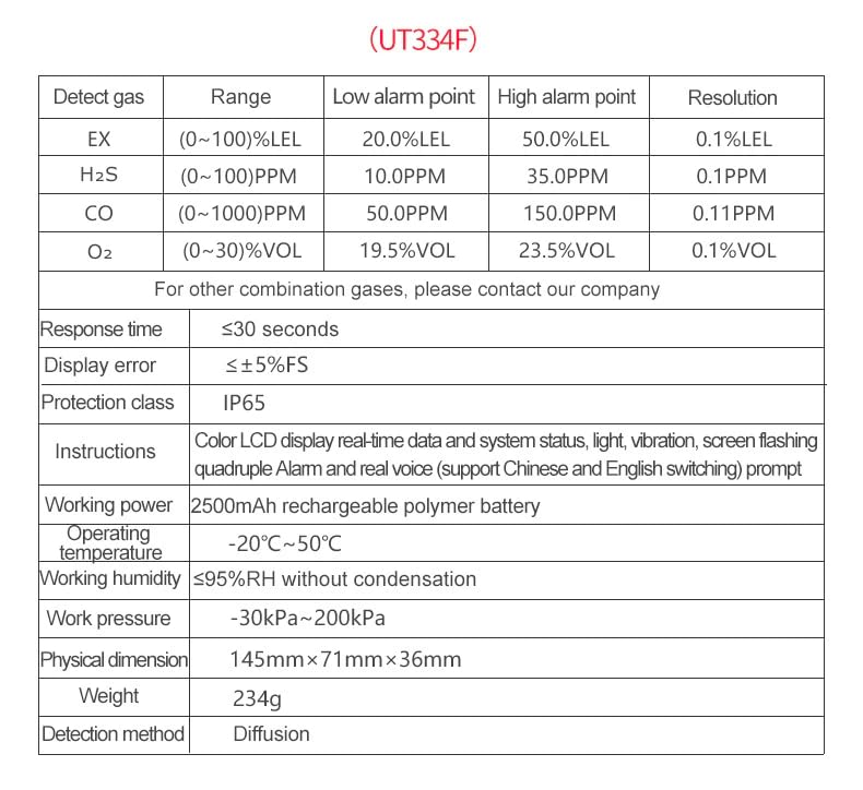 UT334 Series Gas Detector●UT334 series is a portable voice type four-in-one gas detector, a safety device that can continuously detect the concentration of leaking gas. ◆Using advanced integrated circuit technology, embedded microcomputer control, high-quality imported gas sensors, with excellent sensitivity and excellent repeatability; using dot matrix LCD display, support for Chinese and English interface and Chinese and English voice prompts, easy to use and maintain; shell using high-strength engineering plastic, good vibration resistance, high strength, with dust, waterproof, explosion-proof and other functions. ●Features●1. English and Chinese●Switching 2. Sound, light, vibration, screen flashing quadruple alarm ●3. 2500mAh built-in high-capacity lithium battery ●4. Automatic storage can be viewed and deleted●5.2.4 inch color LCD display ●6. High-strength engineering plastic, anti-compression, anti-drop, anti●7. Using imported sensors, sensitive induction, short response time, detection●More accurate 8. Support curve drawing, easy to observe the periodic state of gas concentration