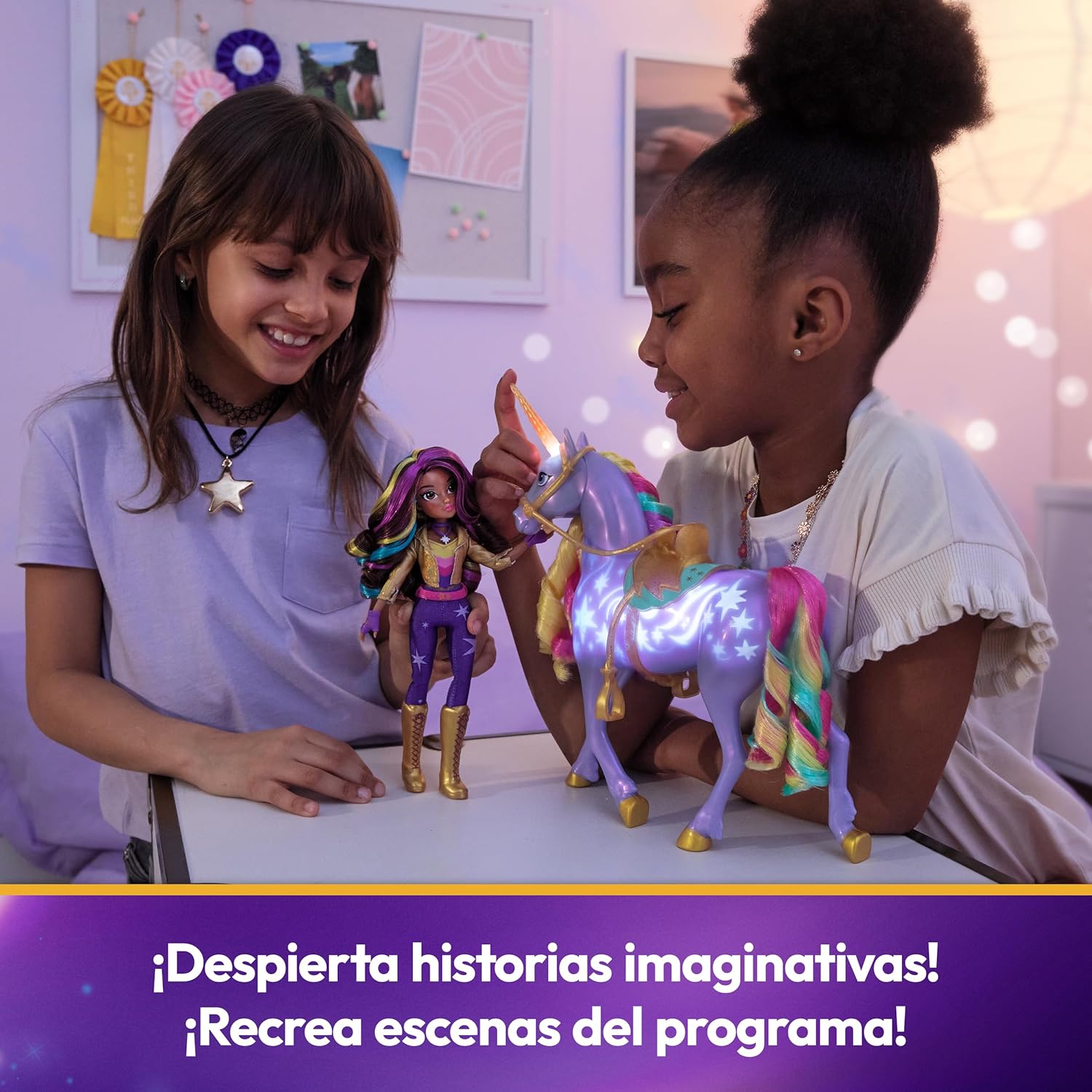The popular Netflix series Unicorn Academy, set on a unicorn island far behind the blue seas, is all about friendship and trust and how to win the fight against evil together. First, the new students must find their soulmate unicorn and form a special connection with it. With heroine Sophia and her unicorn wild star, it takes quite a long time for the spark to skip, they can trust each other and so Wildstar's magic power, the light magic, is unleashed. This process of approaching can also be experienced at home with this special set from the dream team from the series: the interactive unicorn light magic wild star as a 28 cm toy figure with light effects and music as well as his rider Sophia as a 24 cm large dressing doll. Sophia wears her typical riding outfit and has beautifully highlighted and manageable hair. Thanks to its nine articulated points, she can swing elegantly into the saddle to ride with Wildstar into the next adventure. Wildstar is designed in its purple shimmering fur colour with star pattern as well as silky mane and tail with coloured strands. The unicorn has a movable head as well as a removable saddle and bridle. After interactions such as stroking or pulling on the rein, Wildstar begins to gently glow in rainbow colours until she shines brightly after touching her horn and plays the title song "Listen to your heart". Now there is a magical connection between holder and unicorn, Wildstar can then fully unfold her light magic and spin a defense light or light up the path. In addition to this set, Spin Master has many other toys from the series, such as figures of other popular students and unicorns or playsets (sold separately). Fans of the series and all horse lovers will love it. Suitable for all children aged 4 and up