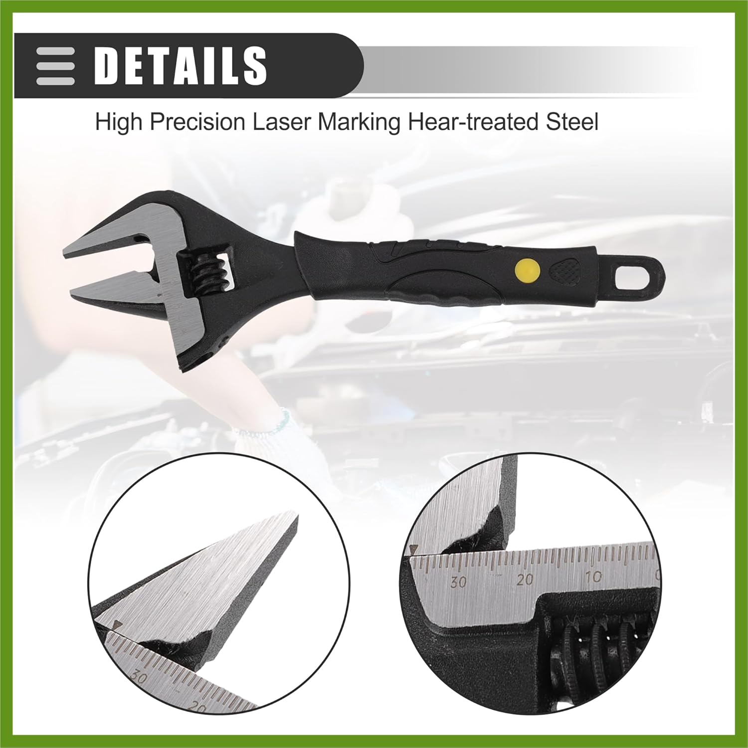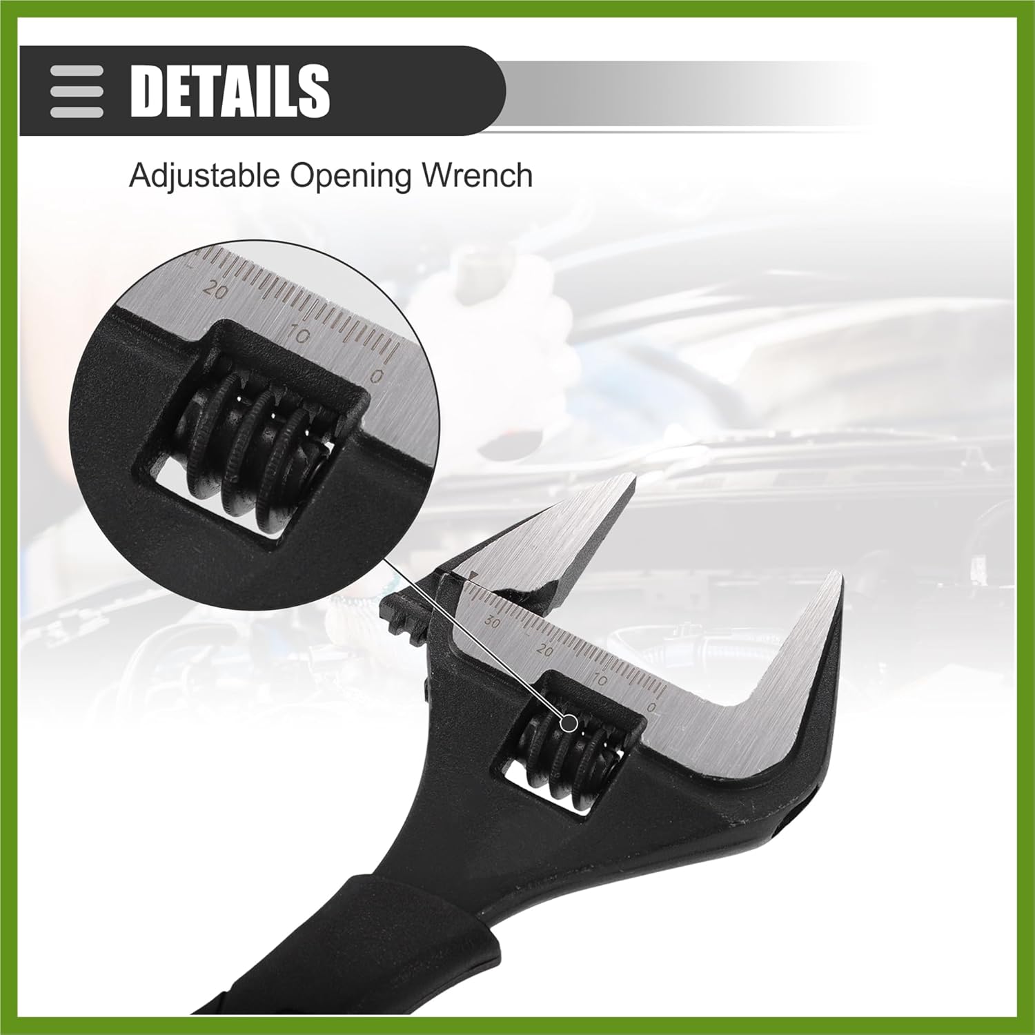 Universal Fit for most tube or nut disassembly and assembly of a variety of automotive equipment, cars, bicycles, etc.Product Details:Color: BlackMaterial: Chrome Vanadium SteelSize--Full Length--Max Jaw Wide:6"/15.24cm--165mm/6.5"--34mm/1.34"8"/20.32cm--215mm/8.46"--36mm/1.42"10"/25.4cm--265mm/10.43"--50mm/1.97"12"/30.48cm--310mm/12.20"--60mm/2.36"Advantage:Reliable material for wider jaw opening.Made of durable heat-treated chrome vanadium steel with good polishing treatment, it's corrosion-resistant and not easy to crack.Laser marking provides accurate measurement.Ergonomically, the handle is comfortable to grip.Kindly Notes:This is a non-OEM product, accessory ONLY!Please carefully check the size you need to ensure you get the correct part.Package Content:4 Pc Adjustable Wrench