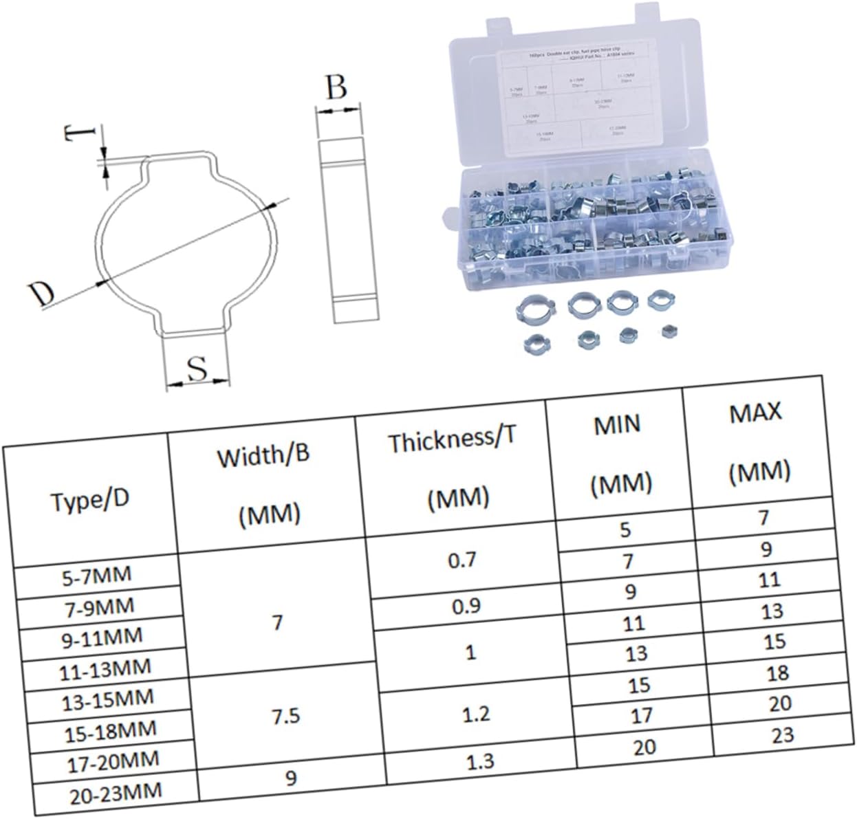 Package Include 160 x hose clamps Features - Size:22.50X11.00X4.00cm/8.84X4.32X1.57in tube clamp - Color: As shown hose clamp. - Application: For automotive fuel lines,small engines,air hose ,silicone vacuum hose etc hose clip. - Material: Carbon Steel. - Warm Tip: Dear buyer, Due to lighting effect, monitor's brightness, manual measurement and etc, there could be some slight differences in the color and size between the photo and the actual item. Sincerely hope that you can understand! Thank you. - Made of carbon steel material, and , long use hose clip clamp. - Fit for hose air hose, water , automotive fuel line, silicone hose use steel hose clamp. - Included an simple storage box, avoid lose and let you storage it more easily gear hose clamps. - Rounded band design, prevent hose damage .Goods Descriptionhose clip It is versatile and easy to use and maintain.hose clip clamp Suitable for mechanical use, also commonly used in industrial, electronic, and automotive .tube clamp Included 8 different kind 160 pcs hose clamps which is mainly made of stainless steel material for and use