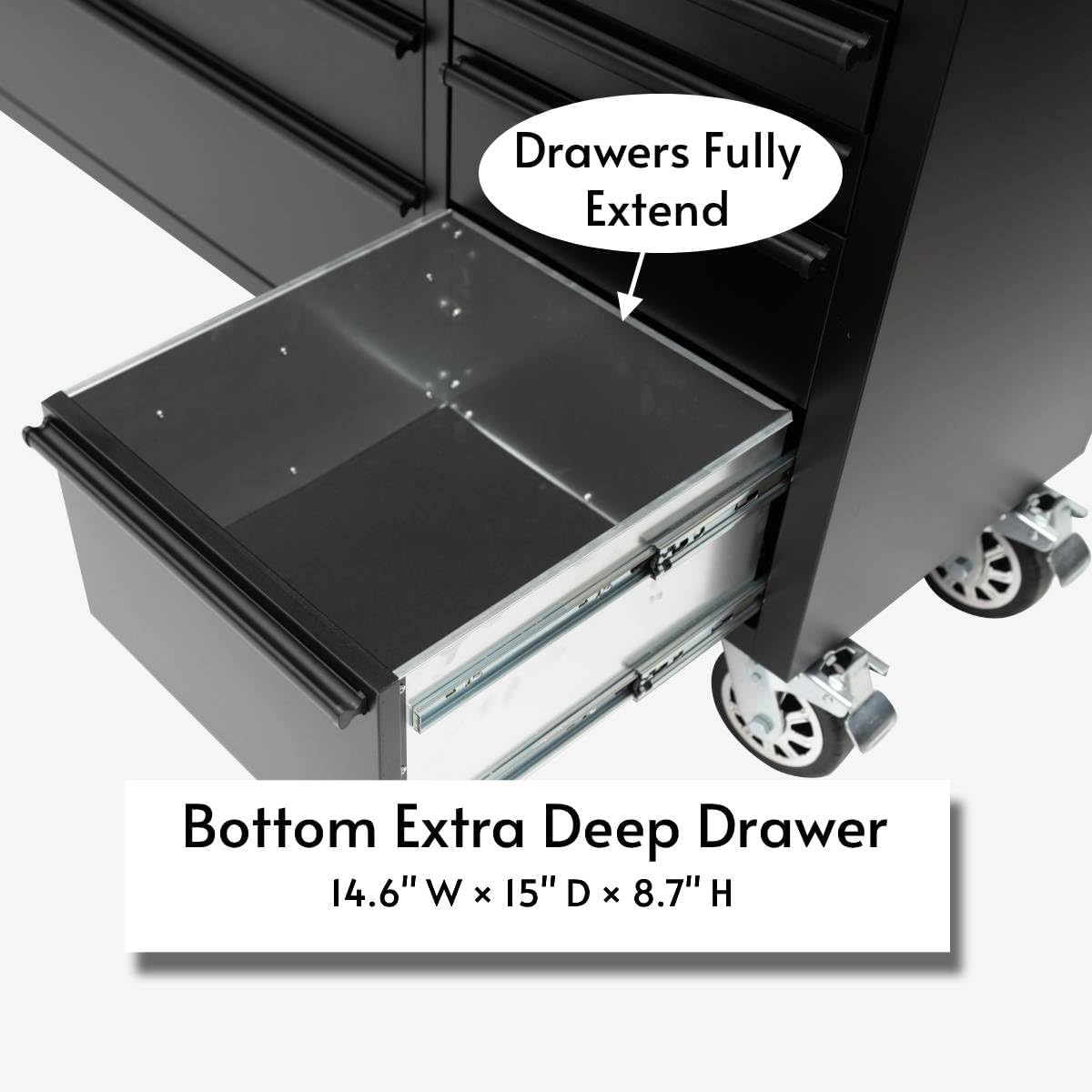 Upgraded 72" Rolling Tool Chest Workstation brings industrial strength and sleek style to any garage, workshop, patio, or hobby center. Constructed from 8 mm steel with a matte black powder-coat finish, it stands on four 6" casters (two lockable) for effortless mobility and rock-solid stability. Key Features - Spacious Worktop: 18" deep solid wood surface supports heavy-duty repairs, builds, and detailing. - 15 Precision Drawers: Three deep, three medium and nine shallow drawers feature 100 lb ball-bearing slides withh 100% full extension design and pre-cut liners to keep tools organized and protected. - Vertical & Overhead Storage: Universal pegboard accepts both round and square hooks; three overhead cabinets accommodate bulkier gear and seasonal tools. - Power & Lighting: Integrated power strip with three outlets, two USB ports and under-cabinet LED lighting ensures you stay powered and productive. - Secure & Durable: Weighing 459 lb empty, its reinforced frame resists flex and wear; single-key locking system secures all drawers and cabinets. Whether you’re a DIY enthusiast or a professional mechanic, the GT718 delivers unmatched organization, convenience, and confidence on every project