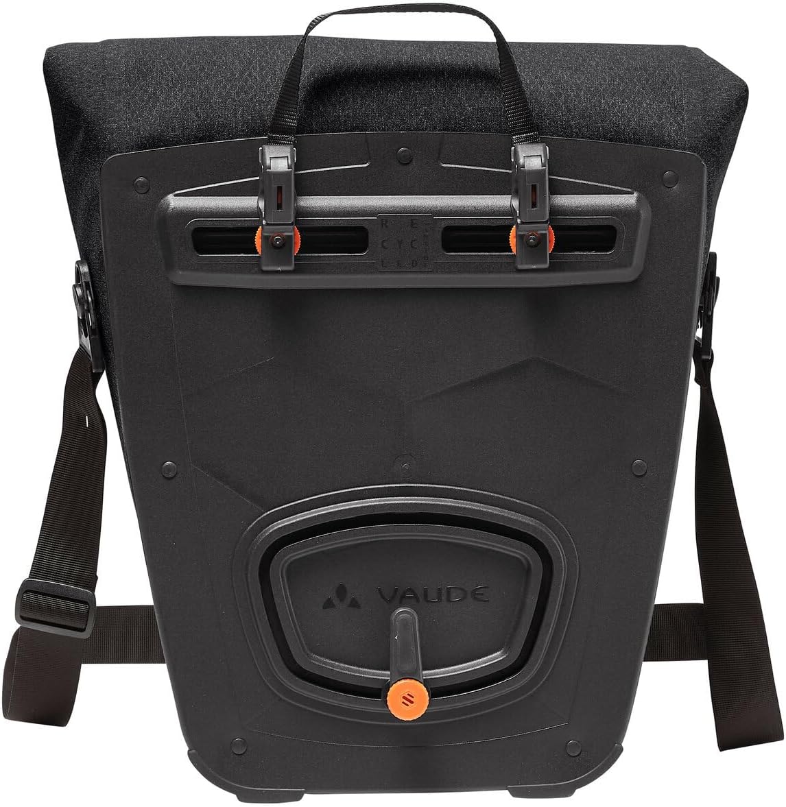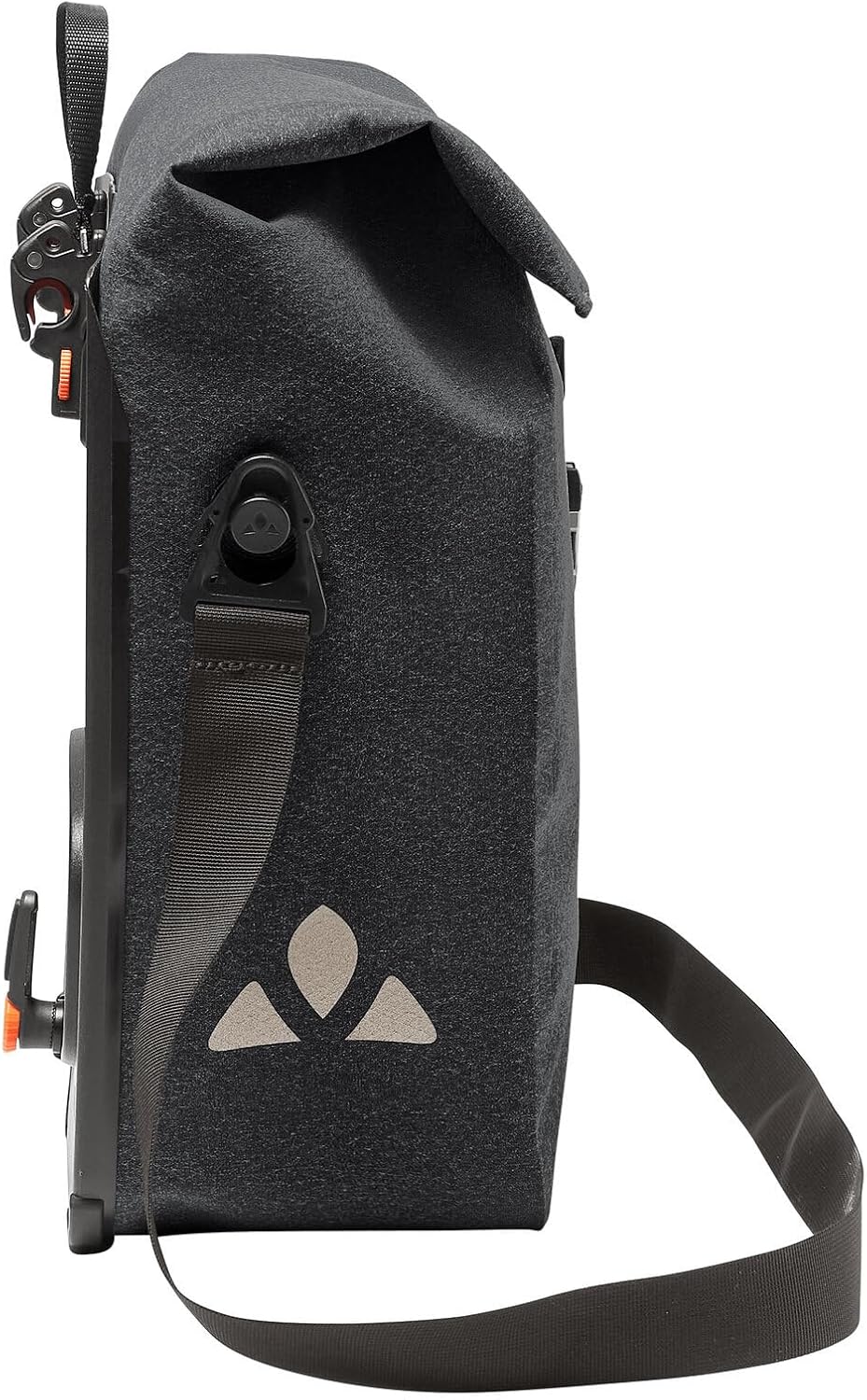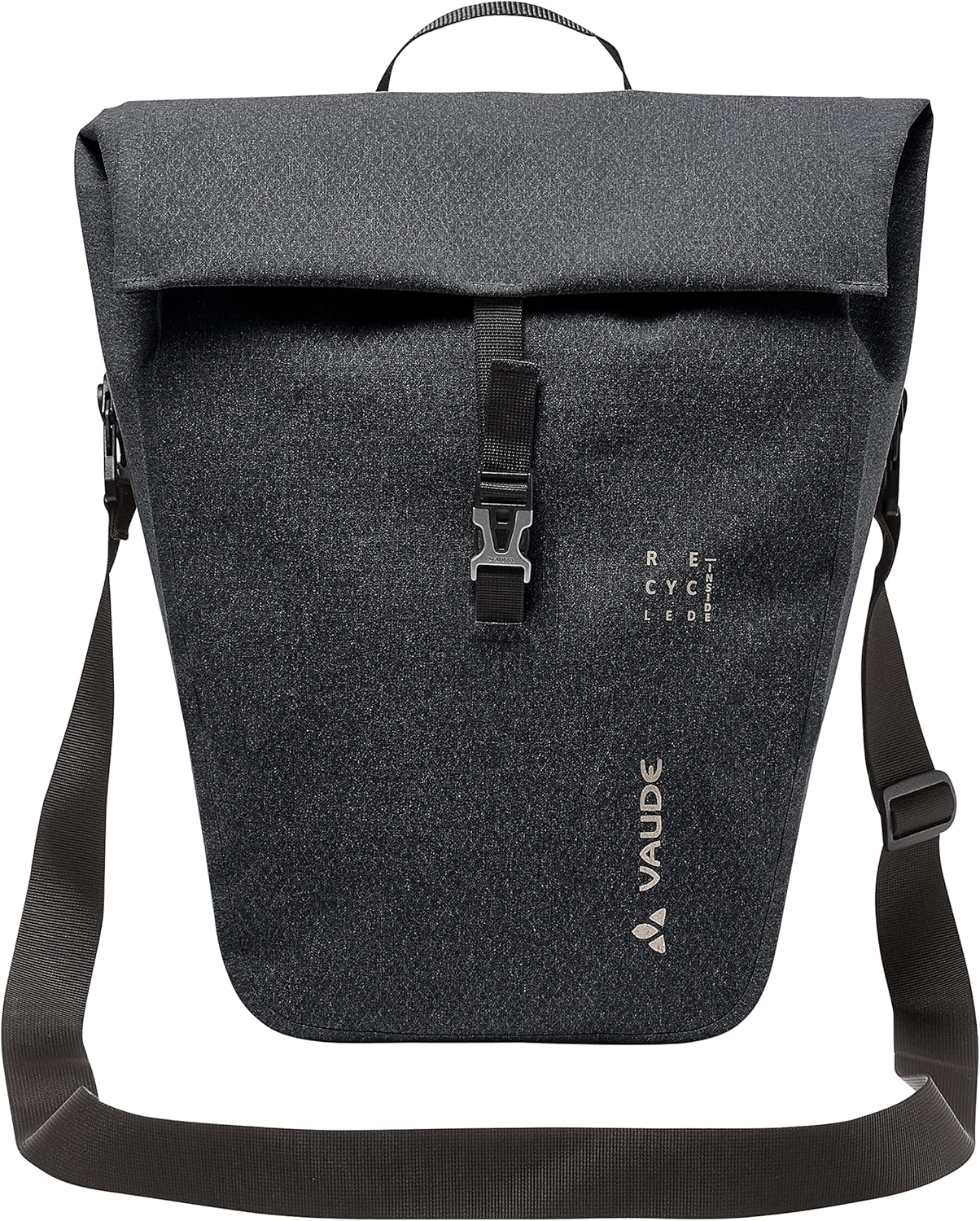 Environmentally friendly and well thought-out - the stylish, waterproof welded ReCycle Commute Single is our thoroughly sustainable everyday companion for bike commuters. A full 22 litre volume and the extensive interior with separate laptop compartment store everything you need in everyday city life well organised: laptop up to 13.3", change clothes, jacket, snack and documents. Small utensils such as mobile phone, wallet and keys can be stored in the additional compartments. Thanks to the stiffened side wall, the bag can be placed tilt-proof. The back plate is made from recycled plastic packaging: this uses an innovative recycling process to produce new, durable raw material. The therefore extremely stable back plate has been equipped with the easy-to-use QMR 2.0 system, so that the bag can be attached and removed with one hand and can also be attached to the right or left of the rear pannier rack. The attachment is adjustable via easy-to-use hand wheels and fits any pannier rack up to a diameter of 16 mm. With the lockable QMR 2.0 mounting system, the bag can be securely locked to the bike. It is also printed with reflective elements. Included is a shoulder strap for transport on foot - for environmental lovers, this bike bag is therefore the ultimate for the daily commute to work. This product is climate-neutral: emissions from materials, manufacturing process and shipping have been holistically determined and systematically reduced. Currently unavoidable emissions have been fully compensated by the independent non-profit organisation "myclimate". Box contents: 1 bag