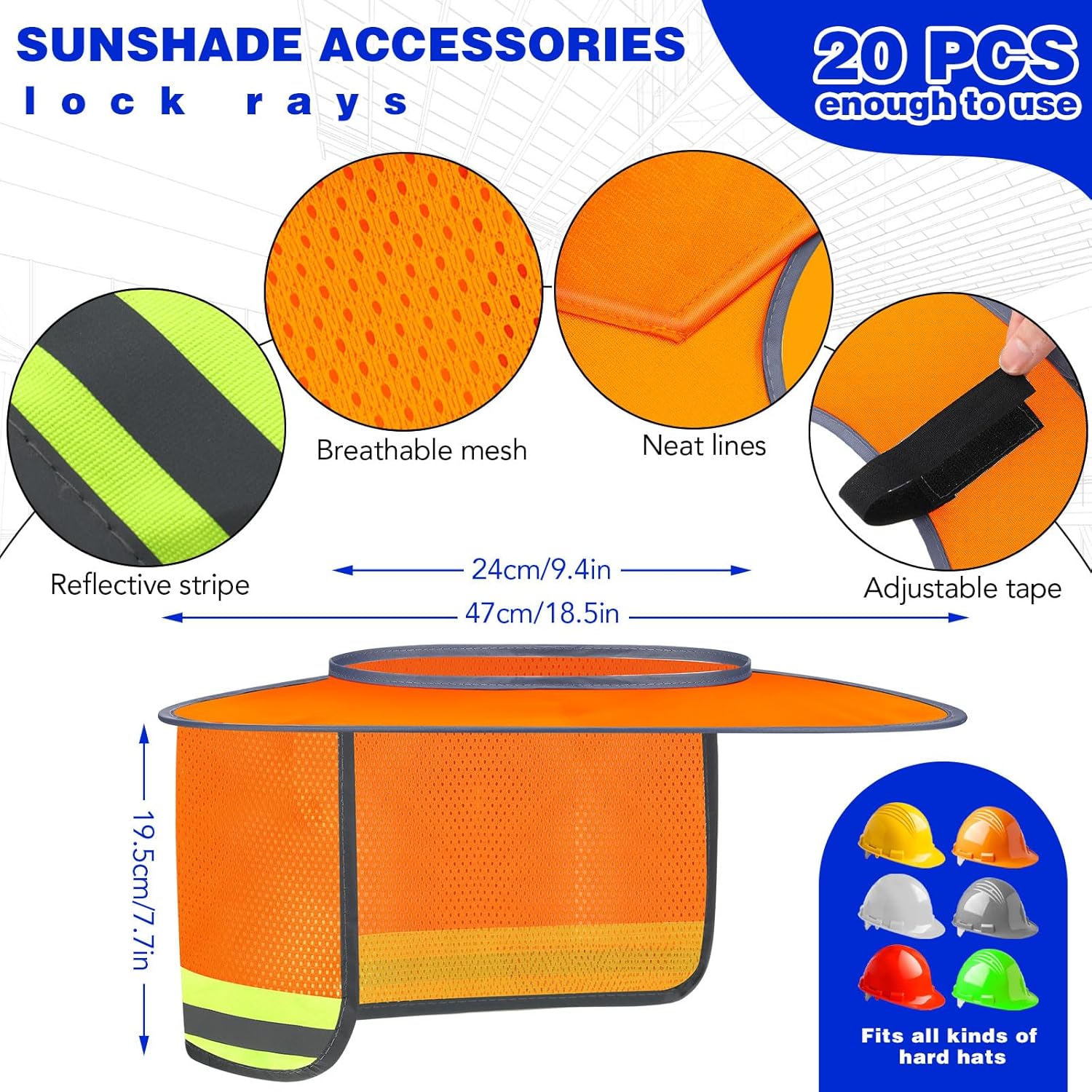 Features: The hard hat visor sun shade has a wide diameter brim, which can efficiently block the sunlight to shine to your eyes and neck, with mesh holes that the breeze can through, bringing a cooler and comfortable wearing experience for you. The hard hats shade can be washed by hand or machine, easier to dry. With reflective stripes that can make you safe even in bad or dim environments. They can be served as gifts to share them with your friends, workers, family members and more. Specifications: Material: mesh cloth materialColor: mainly gray, orangeSize: as shown in the picturesPackage includes: 20 x Hard hat sun shadeNotes: Manual measurement, please allow slight errors on size. The color may exist a slight difference due to different screen displays.