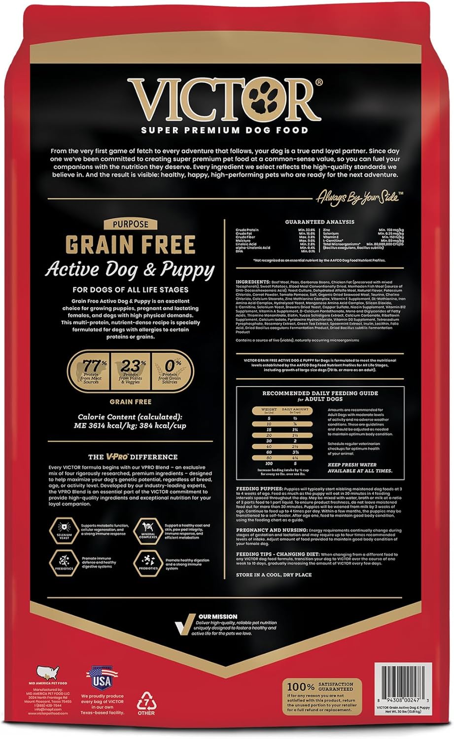 PURPOSE – GRAIN FREE ACTIVE DOG & PUPPY FOOD: Formulated for dogs with allergies or sensitivity to grain, this grain-free dog food for active dogs is an excellent choice for dogs that need high levels of quality protein, including growing puppies and pregnant or nursing females. Made with premium-quality beef, pork and fish meals, this high energy dog food provides the sustained energy required by dogs with high physical demands. This high protein dog food is fortified with vitamins, minerals, essential fatty acids, protein and amino acids, and promotes a healthy immune and digestive system. Suitable for all life stages, this food for active dogs is a dry kibble with 33% protein and 16% fat, and is 3614 KCAL/KG or 384 KCAL/CUP. The protein in this nutrient-rich dog food and puppy food comes from meat sources (77%), and plants and veggies (23%). VICTOR Grain Free Active Dog & Puppy dog food is part of our Purpose line, which is formulated for dogs with particular dietary needs. VICTOR SUPER PREMIUM DOG FOOD: Every VICTOR dog kibble formula is created with our proven VPRO Blend of ingredients – an exclusive mix designed by industry-leading experts to support superior digestibility, strong immune system function, and healthy skin and coat for every dog, regardless of breed, age, or activity level. And the result is visible: healthy, happy pets who are ready for the next adventure. We proudly produce every bag of VICTOR pet food in our own Texas-based facility, and each ingredient used is carefully selected and serves a nutritional purpose. A majority of the ingredients in our dog kibble comes from ranches, farms, and other trusted suppliers who are within a day’s drive of our plant.
