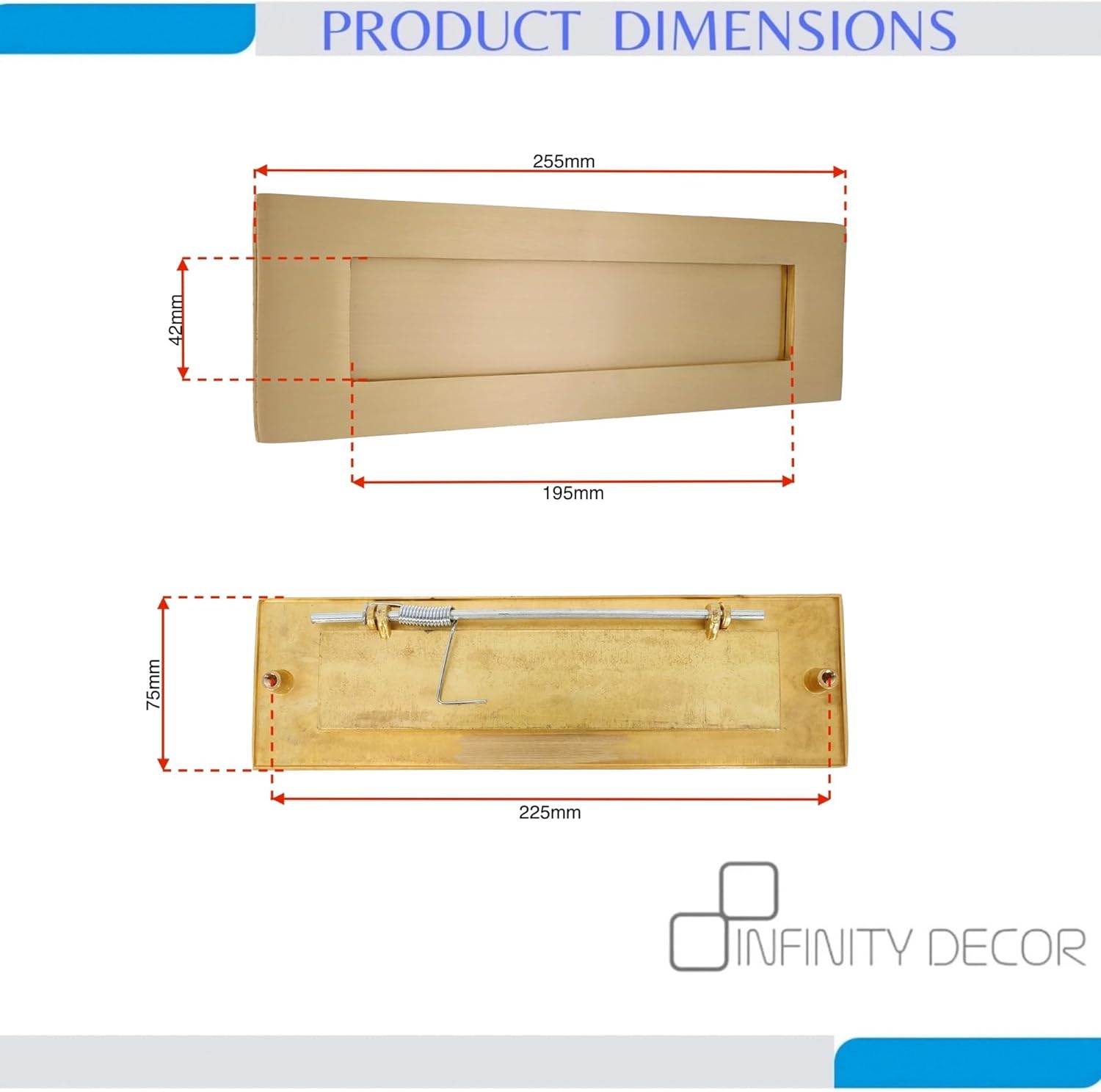 Satin Brass Victorian 10” Letter Plate Enhance the classic appeal of your doors with our Victorian letter plate crafted from premium quality solid brass material. The letter plate served to protect the interior of the door from weather elements while providing a convenient opening for mail delivery. Comes with heavy duty double sprung mechanism that enables smooth movement allowing easy mail delivery. The Victorian design of this door letter plate adds visual interest and enhances the overall aesthetic appeal of your door, making them stand out as a focal point in your space. Due to its design and timeless look, it complements a variety of interior styles including traditional and modern settings. Manufactured from high quality solid forged brass material using traditional forged methods for exceptional strength, durability, resistance to corrosion, and reliability. You can feel the quality of the brass weight once you grasp them. This inward opening letter plate is suitable for any type of front or back door and automatically closes once the package has passed through the aperture. Comes with heavy duty double sprung mechanism that enables smooth movement and keeping it closed and preventing noise in windy conditions. Spacious letter slot to fit standard sized mail and envelopes, ensuring convenient mail delivery. It provides a protective barrier against the elements, keeping your mail safe and secure. Designed to suit a variety of door types including wood, metal, and uPVC. They can be used in both residential and commercial doors and are perfectly suitable for outdoor use also. Premium satin brass finish lends a sleek touch to the letter plate and adds warmth and luxury to your door, providing a stylish and cohesive look. It comes with protective coating which ensures it is rust and corrosion resistant. This letter plate is easy to Install with included fixings, installation is quick and hassle-free. This product is the letter plate only. Matching interior letter tidy flap for the inside of door is available and are sold separately. Pack Includes: 1x Victorian Letter Plate Matching Screws Specifications: Material: Solid Brass Finish: Satin Brass External dimensions: Length: 250 mm - Width: 75mm Internal dimensions: Length: 195 mm - Width: 45 mm Distance between screw hole centres: 225mm