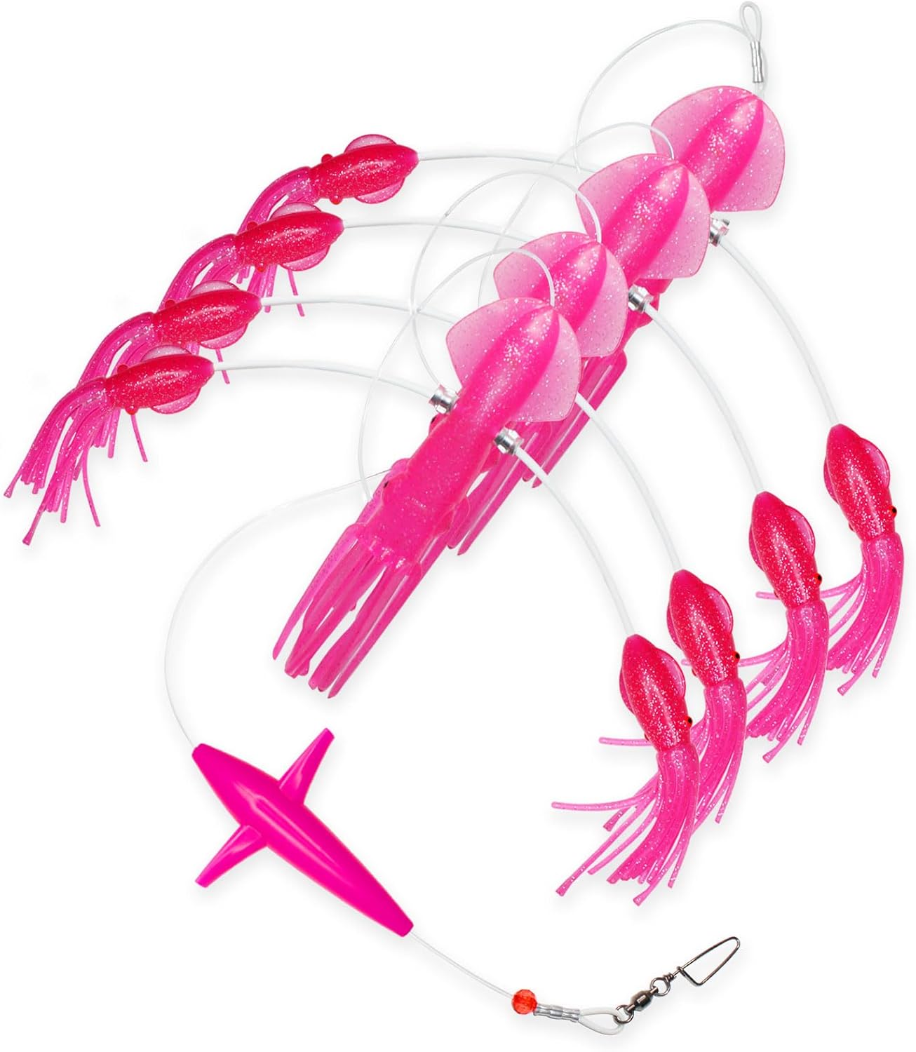 Our fishing squid teasers are incredibly lifelike, made of high-quality rubber. They consist of four 9-inch large squids, eight 5.2-inch small squids, and a 5-inch bird, designed as a tandem rig. They display an enticing swimming action in the sea, stimulating large fish to launch a fierce attack. Specifically designed to withstand harsh marine environments and high-speed trolling, they are the ideal equipment for sea fishing enthusiasts.