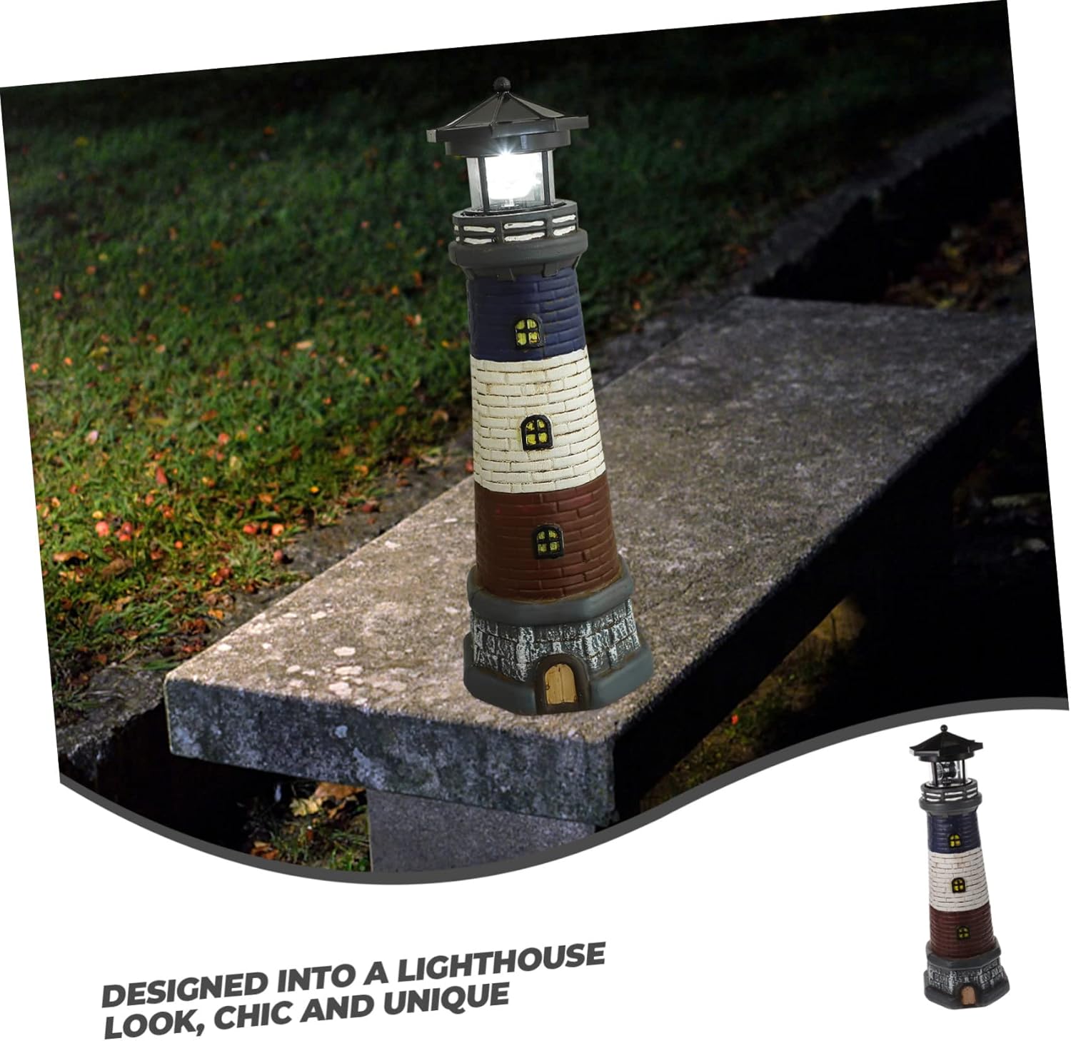 Package Include 1 × Solar-power Lighthouse Statue Features -Material:Resin lawn fence light - Color: ornament -Rated Power: 0.04W camping lighthouse light -Battery: 1.2V 300mah AAA battery funny garden lighthouse -Solar panel: 2V 40mah resin solar light - Size: 12.00X12.00X37.50cm/4.72X4.72X14.74in solar rotating lighthouse -Light Source: LED solar outdoor lighthouse -IP Grade: IP55 yard ornamental lighthouse - Wide application, the solar lighthouse is perfect for decorating your garden, home, lawn, porch, path, etc lighthouse lamp garden ornament. -Continuous lighting time:6-12 hours solar powered lighthouse - This lighthouse statue with light can be a perfect present for your families and friends who love nautical decorations lawn lighthouse. - Made of premium resin material, this lighthouse ornament is durable and can be used for long time garden solar resin lamp. - Designed into a lighthouse look, chic and unique, the resin craft decor has good decorative effects solar yard stakes. - The light on the lighthouse statue is solar-powered, which absorbs sunlight in the day and glow at night, solar garden stakes.Goods Informationsolar powered lighthouse This kind of lighthouse can be used as garden, lawn, yard, shop decoration, which will make your garden decoration more rich.rotating solar lighthouse This creative lighthouse ornament with solar-powered light design is made of premium resin material, not easy to break or deform