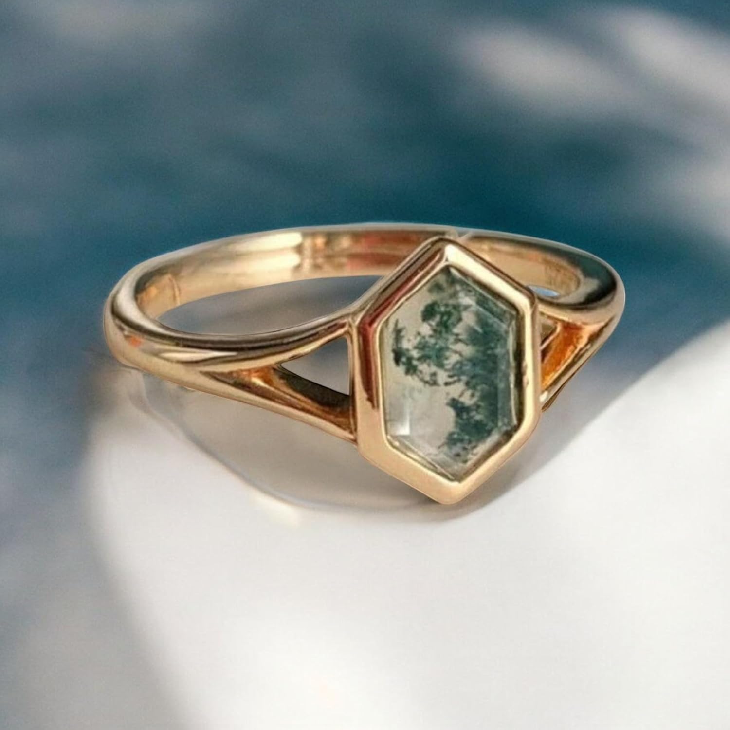 Vintage Bezel Setting Moss Agate Wedding Ring Split Band Bridal Promise Ring Handmade 18K Yellow Gold Proposal Ring Solitaire Alternative Birthday Gift Discription :- Main Stone - Moss Agate ( Natural) Stone Color - Green Stone Shape - Hexagon Stone Size - 8x6