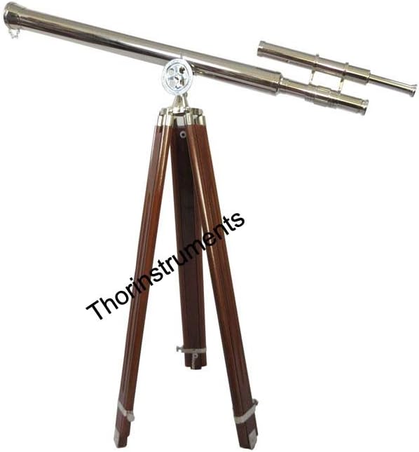 Vintage Solid Brass Marine Navy Double Barrel Telescope Brown Wooden Tripod