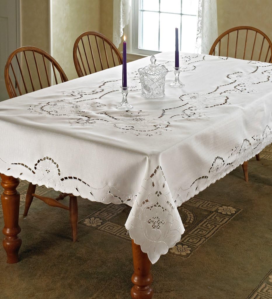 This 100Percent polyester, old fashioned magnificent tablecloth will enhance your formal event with the touch of tradition, first class embroidery workmanship, very easy care machine washable, little or no ironing required