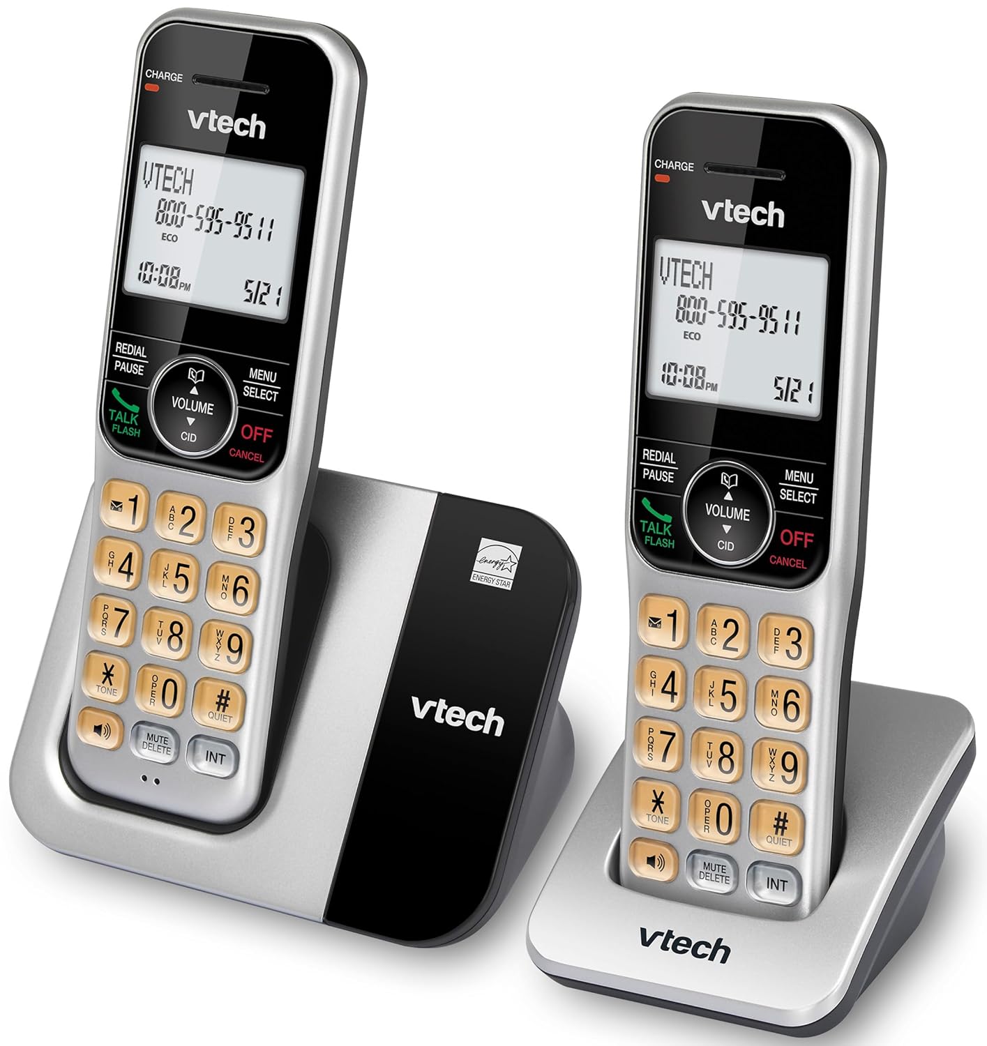 The VTech CS5319-2 2-Handsets Cordless Phone System is designed for busy households and offices, offering everyday convenience with practical features you need. The phone system comes with 2 handsets. Our Call Block feature makes it easy to screen and block nuisance callers, including robocalls, telemarketers, and other unwanted numbers. Add up to 20 numbers to your Call Block directory. (Caller ID subscription required.). Stay connected with our Full-Duplex Speakerphone without dropouts or delays. Whether you are catching up with family or managing business calls, you can speak and hear simultaneously, just like a natural face-to-face conversation. The 2-inch white backlit display ensures easy readability in any lighting. Adaptable for all situations, whether you are making late night calls or chatting during the day, every name and number appears sharp and easy to read on the bright display. Manage your calls with ease using Caller ID and storage for up to 30 numbers. Instantly see the caller’s name, number, date, and time. Need a phone in the kitchen, bedroom, or office? With flexible room-to-room communication, easily expand your phone system that supports up to 5 handsets with only one phone jack. (Compatible with CS5309, sold separately.). Powered by DECT 6.0 digital technology, this system delivers interference-free audio, secure transmission, and extended range. With ECO Mode, the phone optimizes energy usage by reducing transmission power when the handset syncs with the base. This smart feature helps extend battery life, lowers energy usage, and reduces your environmental footprint.