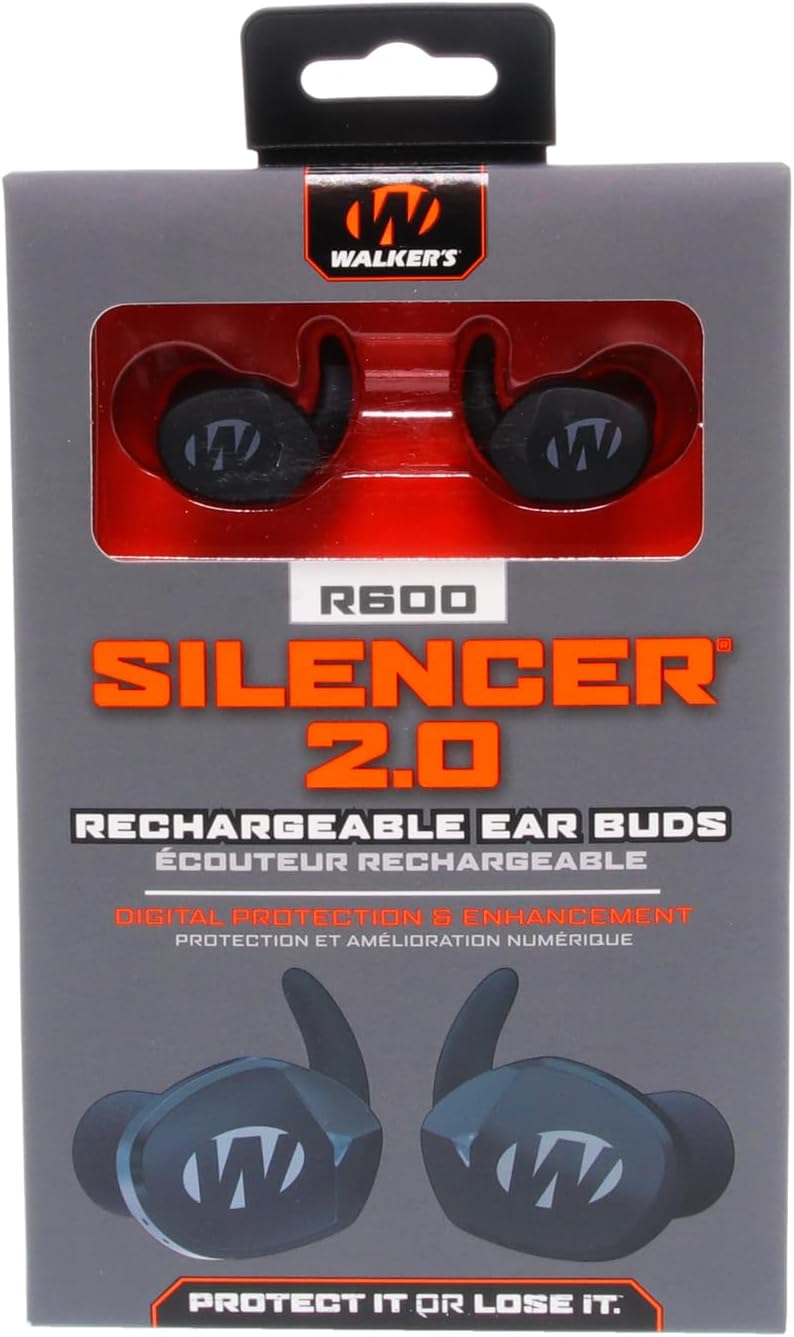 WALKER'S SILENCER 2.0 R600 RECHARGEABLE EARBUDS - NOISE-CANCELLING HUNTING GUN RANGE SHOOTING ELECTRONIC EARBUDS The Silencer 2.0 R600 Rechargeable Ear Buds provide all-day comfort & customization with the patented Sure-Lock system. Delivering crystal clear digital hearing enhancement, the Silencer also protects hearing by utilizing Walker's SAC - Sound Activated Compression technology. Form meets function, all in a compact in-the-ear design. These shooting ear buds have a touch interface, which is located on the front surface of the headphones and is responsible for volume control. Each of the Silencers has a built-in red LED that informs the user about the charging process and turns off when fully charged. SPECS: - NRR 24dB - noise reduction rating; - Advanced digital circuit with touch button controls; - 3 sizes of Sure-Lock fins and foam tips (SM / MD / LG); - Digital protection with SAC (Sound activated compression); - Digital sound processing delivers optimum hearing enhancement; - Auto shut off; - Much More Stable Left/Right Earbud Connection; - Touch Button Controls; - Dynamic Wind Noise Reduction; - Variable Gunshot Suppression; - Voice Prompts; - Rechargeable Lithium Battery + Rechargeable Lithium Battery In Dock.