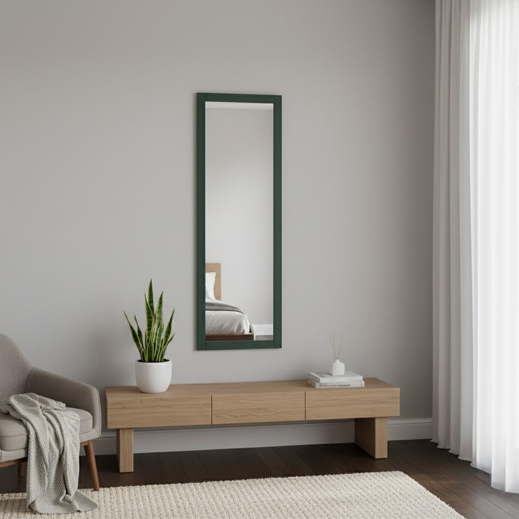 Dimensions: L 50 cm / H 140 cm / D 1.5 cm Colour: Green Material: MDF coated with decorative white satin solid colour. Mirror with high reflection index and top quality. Mirror Safe protection, ensures user safety in case of breakage of the mirror. Installation: It can be installed both horizontally and vertically thanks to the dual support equipment, easily adjustable (wall mounting plugs not included). Description: The mirror is an element that in addition to providing a very useful function, it is also able to furnish with extreme taste, a lot of refinement and great elegance. The mirror can be used in different rooms in the entrance or in the living room to visually furnish and expand the spaces, or in the bedroom as a useful aid to make up and control clothing. Thanks to its special design and shape, our mirror is able to adapt perfectly to any style and any type of decor.
