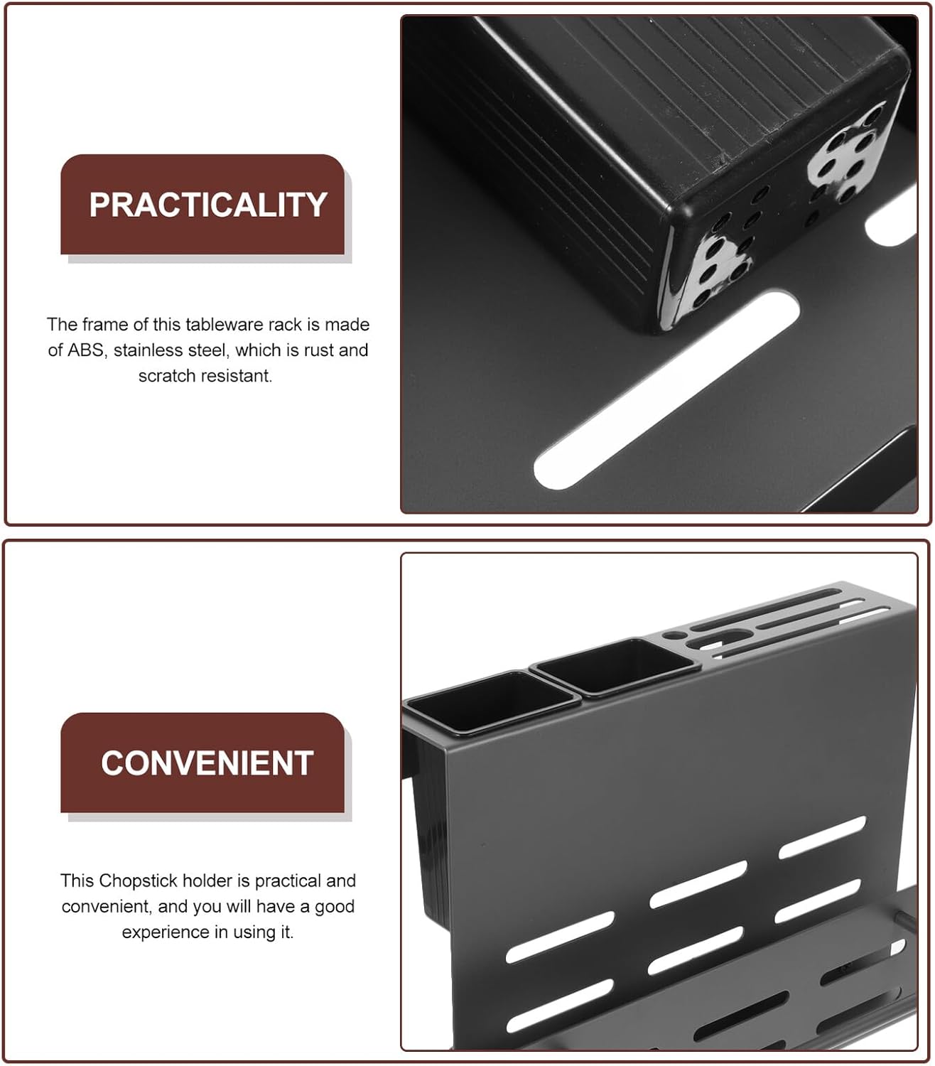 Package List 1 x Wall Organizer Characteristics -Material:ABS, stainless steel -Color:Grey -Size:27.50X20.50X14.50cm/10.81X8.06X5.70in (whole) -Size:10.30X6.50X5.00cm/4.05X2.55X1.97in (removable tableware holder part) -Product Info:Wall-mounted tool storage rack -Contemporary look blends well with most modern design style, which is decorative. Can be used as a practical housewarming to your friends, they will be very happy chopstick holder. -Wall Chopstick Holder has simple and fashion design, elegant and beautiful, it will not take much room kitchen chopstick holder wall-mounted racks. -There are drain holes below of the utensil holder for utensil to dry, and can draining water conveniently cooking utensils holder. - cutlery of different sizes, holding spoons, forks, chopsticks, and other small utensils, and store a cutting board. - You can also install this cutlery organizer on wall, which can help to save desktop space cooking utensil holder.Goods Informationwall mounted chopstick holder This item is a kitchen Chopstick Holder.wall-mounted utensil holders It is made of ABS, stainless steel material, it can your kitchen flatware firmly, such as forks, spoons and so on.kitchen chopstick holder wall-mounted racks It will make your kitchen in order.chopstick storage rack Flat bottom, stable standing