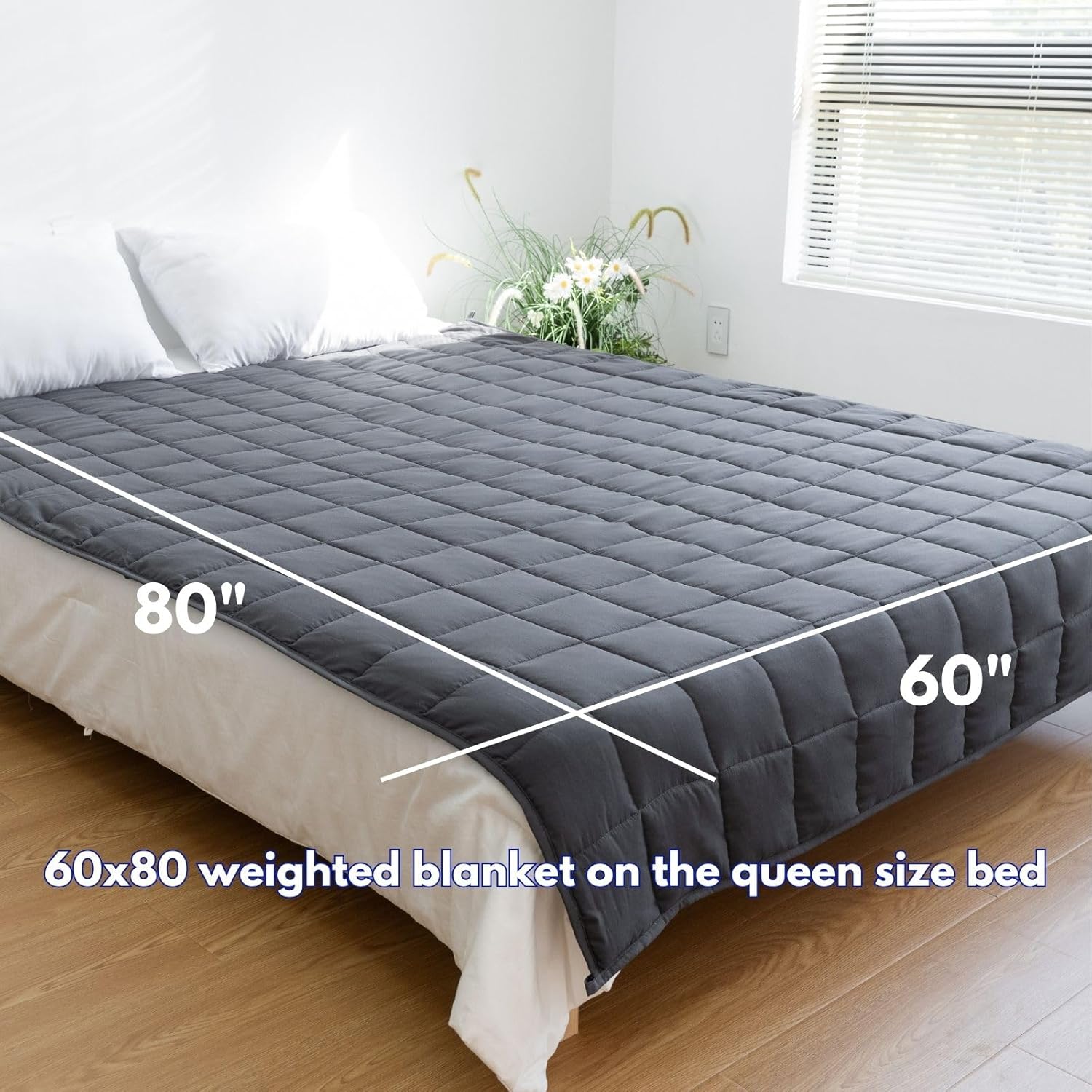 Experience the ultimate comfort with this premium weighted blanket, expertly crafted for deeper, more restful sleep. Measuring 60x80 inches and weighing 20 pounds, this blanket is ideally sized for queen beds and perfect for individuals or couples with a combined body weight of 200-220 pounds. The elegant grey blanket features precise 5x5-inch quilted squares with delicate, uniform stitching (2.5-3mm per stitch) that ensures even weight distribution. Reinforced loops provide added durability and convenient attachment points. The blanket's close-fitting design creates a gentle, calming pressure that helps promote relaxation and better sleep quality. Following the recommended 7-10% of body weight guideline, this blanket offers the perfect amount of pressure without feeling overwhelming. The thoughtful construction and premium materials make this weighted blanket a luxurious addition to your bedding collection.